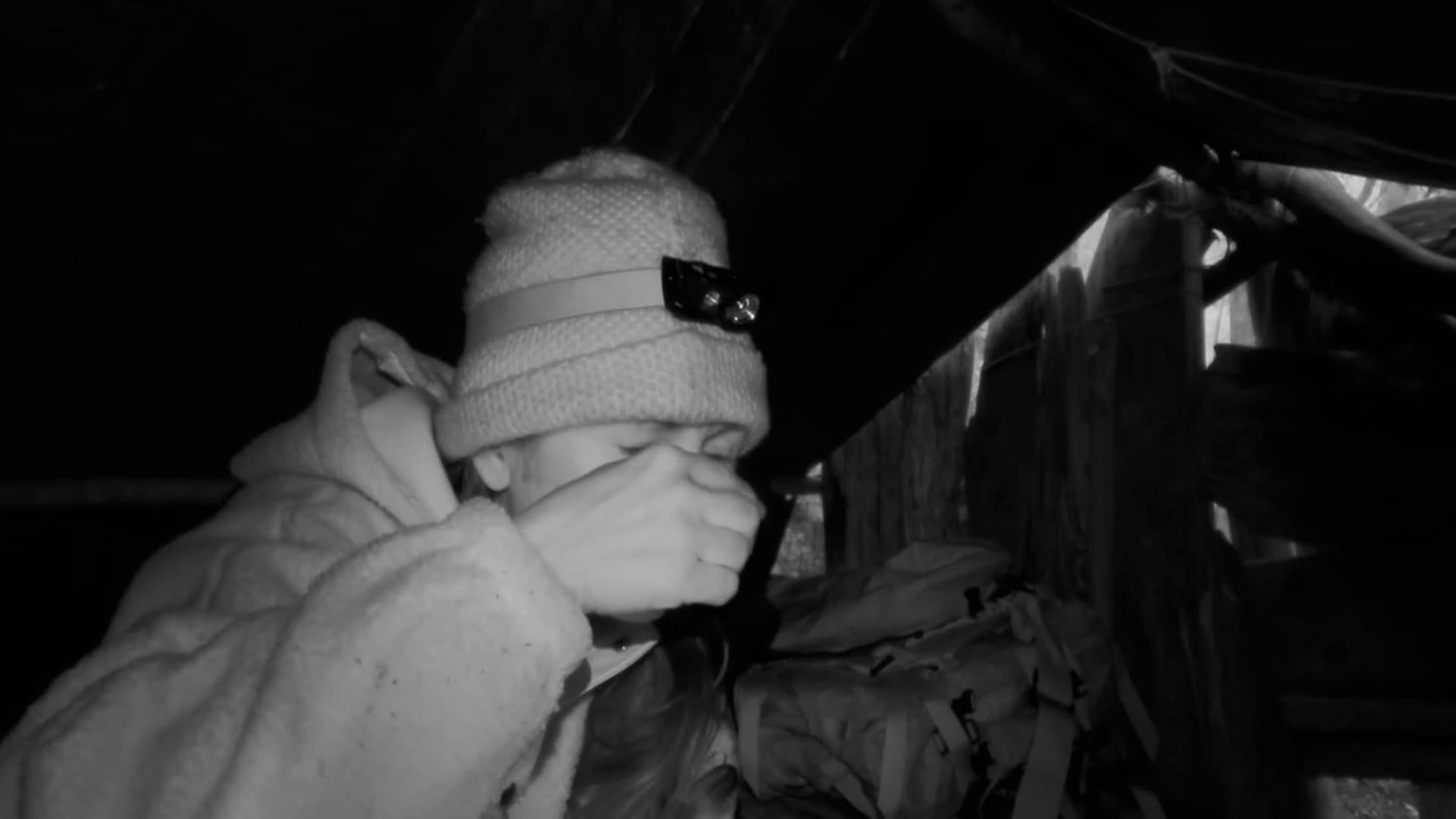 It looks like he’s in a bivvy, or just under a canvas coat? I haven’t spotted that before. A -10 degree sleeping bag is a pretty strong option, but when it’s close to zero, plus wind chill, and rain, and his shelter is trapping no heat, and he’s starving, I bet it’s not doing that much.