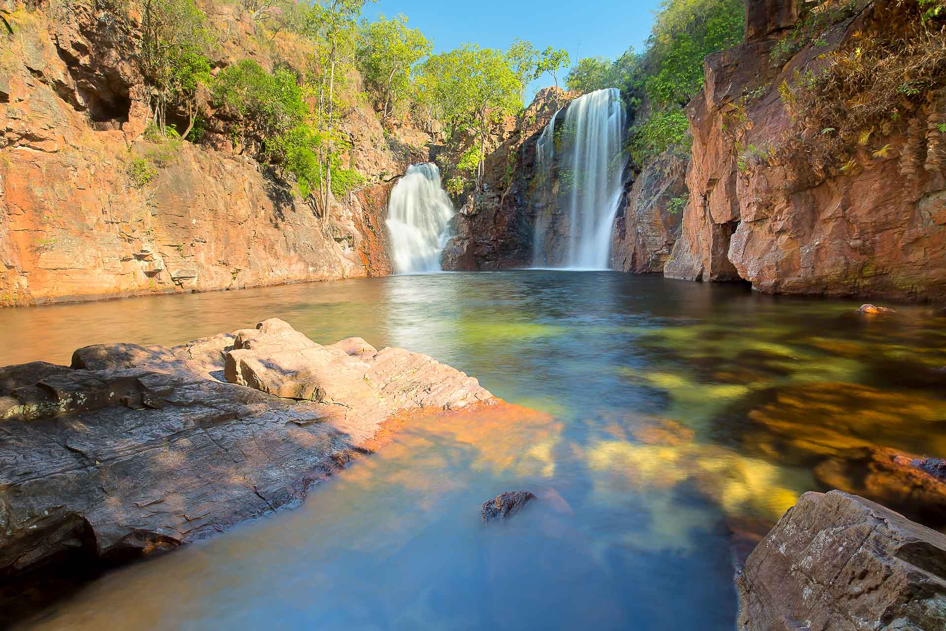 ‘Heading mostly through Litchfield’s savanna woodland – an endless open forest of eucalypts dotted with sand palms and cycads – the trail follows and crosses creek lines (both dry and wet). Occasionally a break from the heat is given by shady, monsoon forest. There’s plenty of rock, whether loose underfoot, towering pillars, or giant mounds of boulders. The trail’s plateau-top position offers unexpected views across the open landscape and opportunities for swimming as the pristine waterways fall to the escarpment edge.’