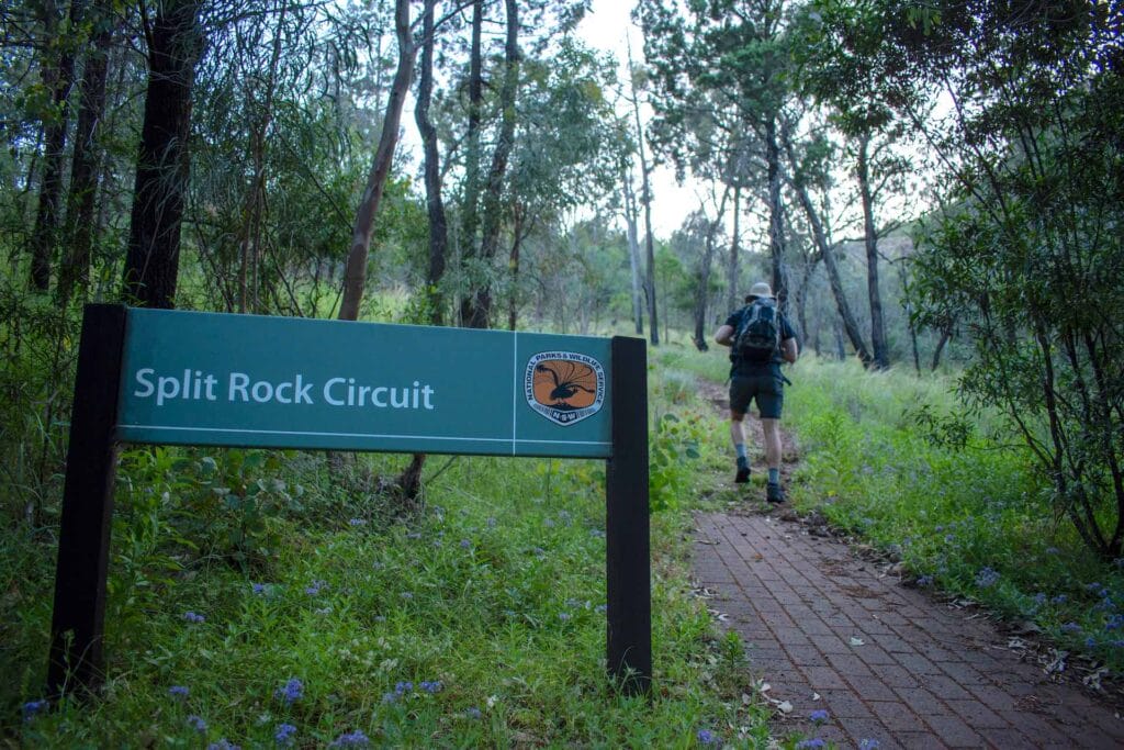 The Belougery Split Rock loop trail starts from Split Rock Picnic Area. Walk along Burbie Firetrail for 500m before turning left to Belougery Split Rock. The track circles around the eastern side of Belougery Split Rock where there’s a steep 800m out and back side track to the summit. Return the same way or continue along the loop back to the car park.