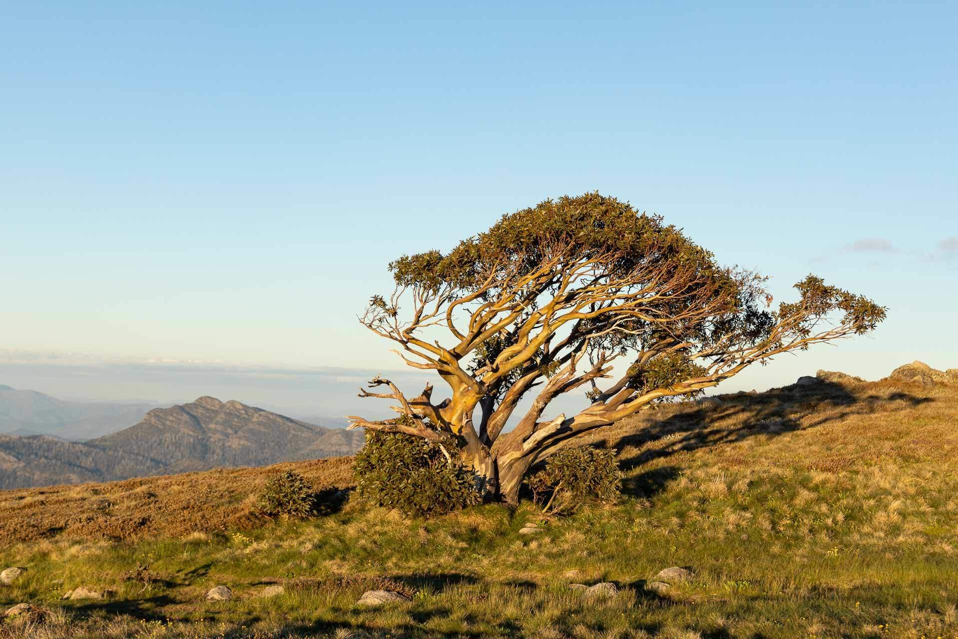The Two Peaks hike starts deep in the valley and winds along the Delatite River, crossing countless log bridges as snow melt flows below. You’ll see cool forest give way to Alpine ash and Snow gums (and countless micro-environments in between) as you climb a whole vertical kilometre to the Bluff Spur Memorial Hut and campground.