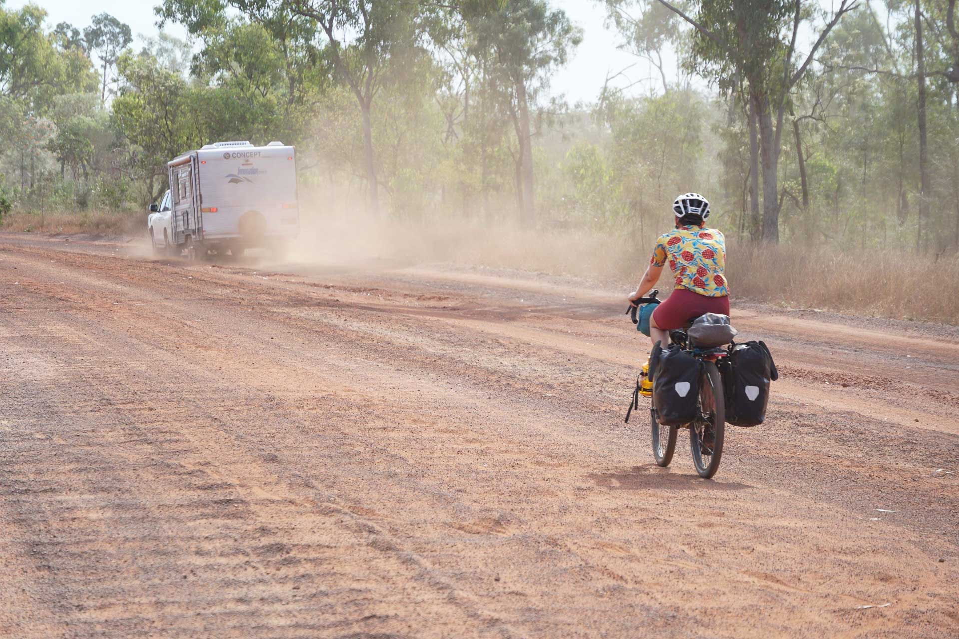 Tired and weary, we schlepped along the highway, where road trains and caravans sped past us at 130km an hour. The shoulder was a distant memory and the side of the highway was littered with metal and glass discarded long ago.
