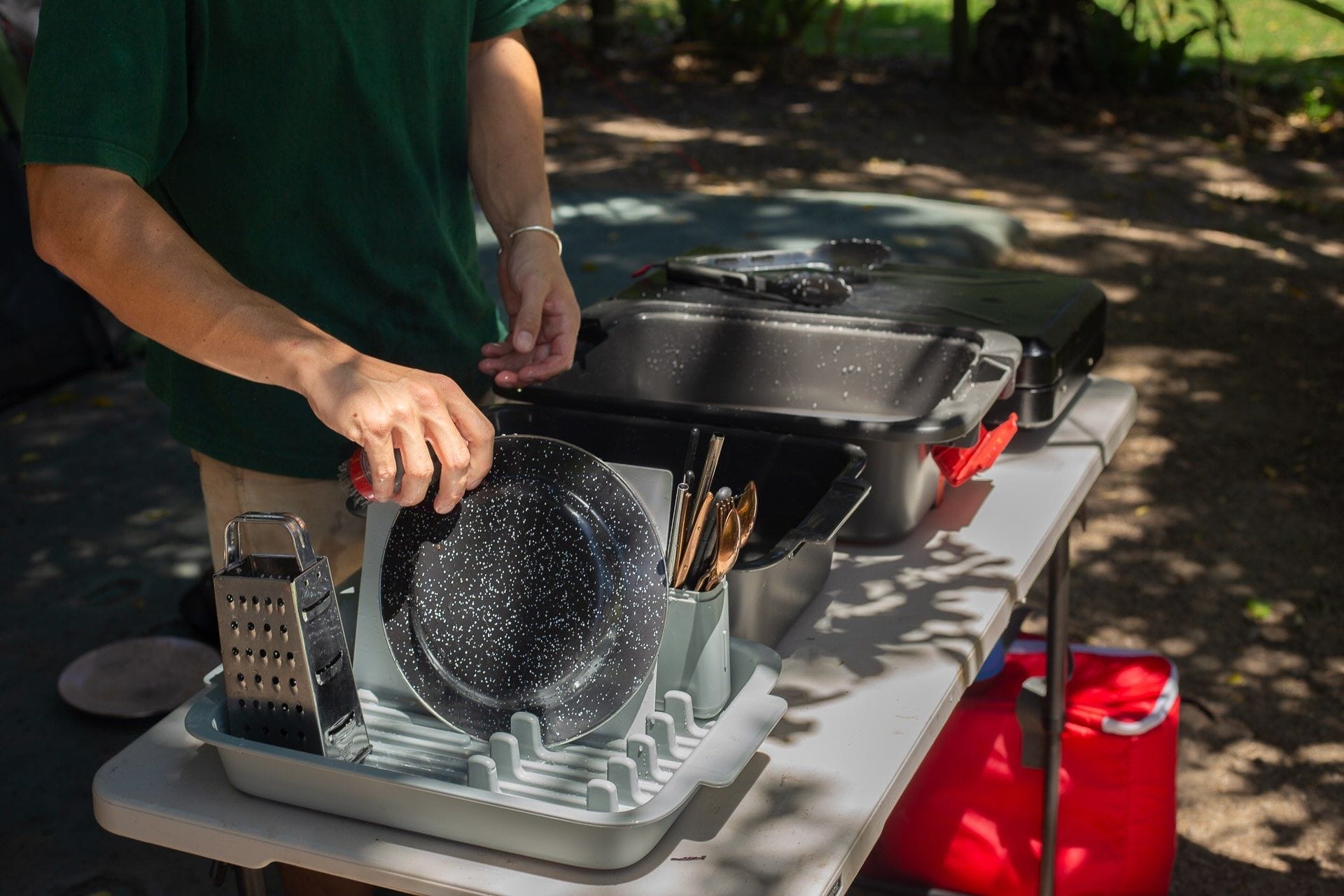 OXO Outdoor Wash Dry and Stow System, washing dishes, camp kitchen, portable sink, dish brush, drying rack, camping chores, outdoor