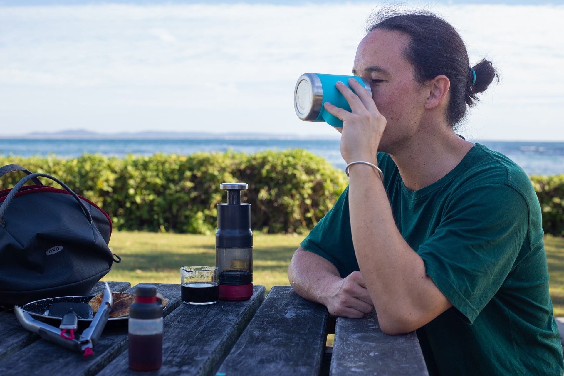 OXO Rapid Brewer, brewing coffee, with crema, wooden table, outdoor setting, camping, camp kitchen equipment