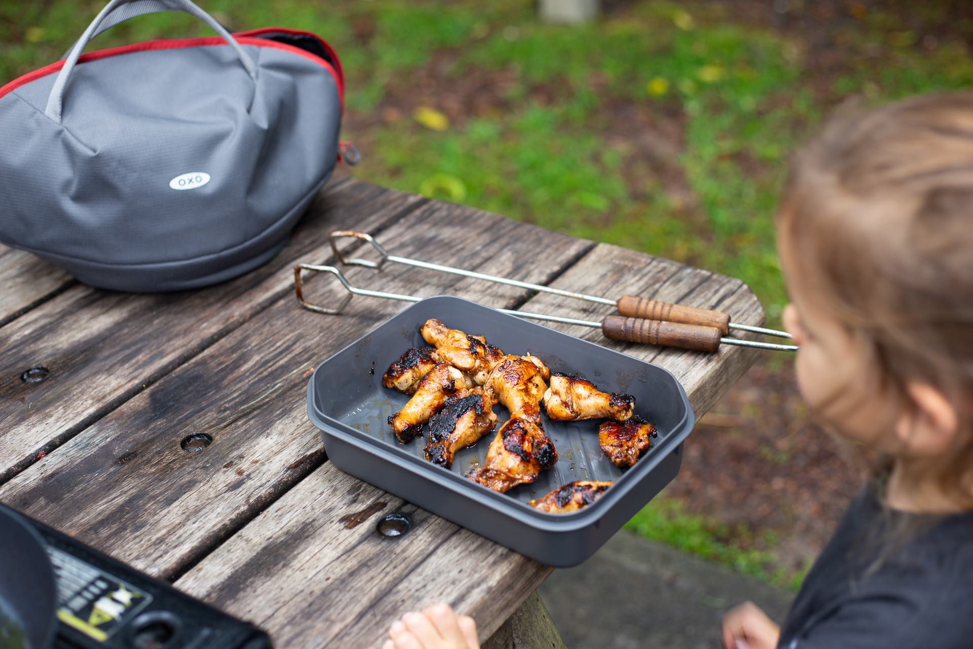 OXO Outdoor product, grey travel bag, red zipper, camping gear, wooden table, outdoor camp kitchen
