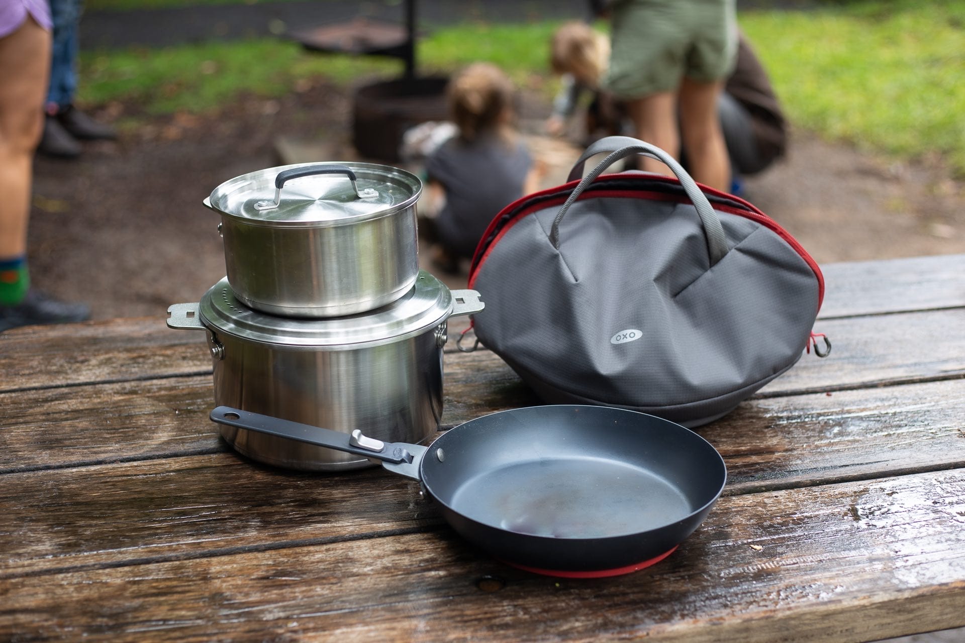 Maybe the biggest improvement to my set-up is the OXO camp cookware set, which conveniently fits two family-friendly sized cooking pots and a carbon steel fry pan neatly into a ready-to-go travel bag.