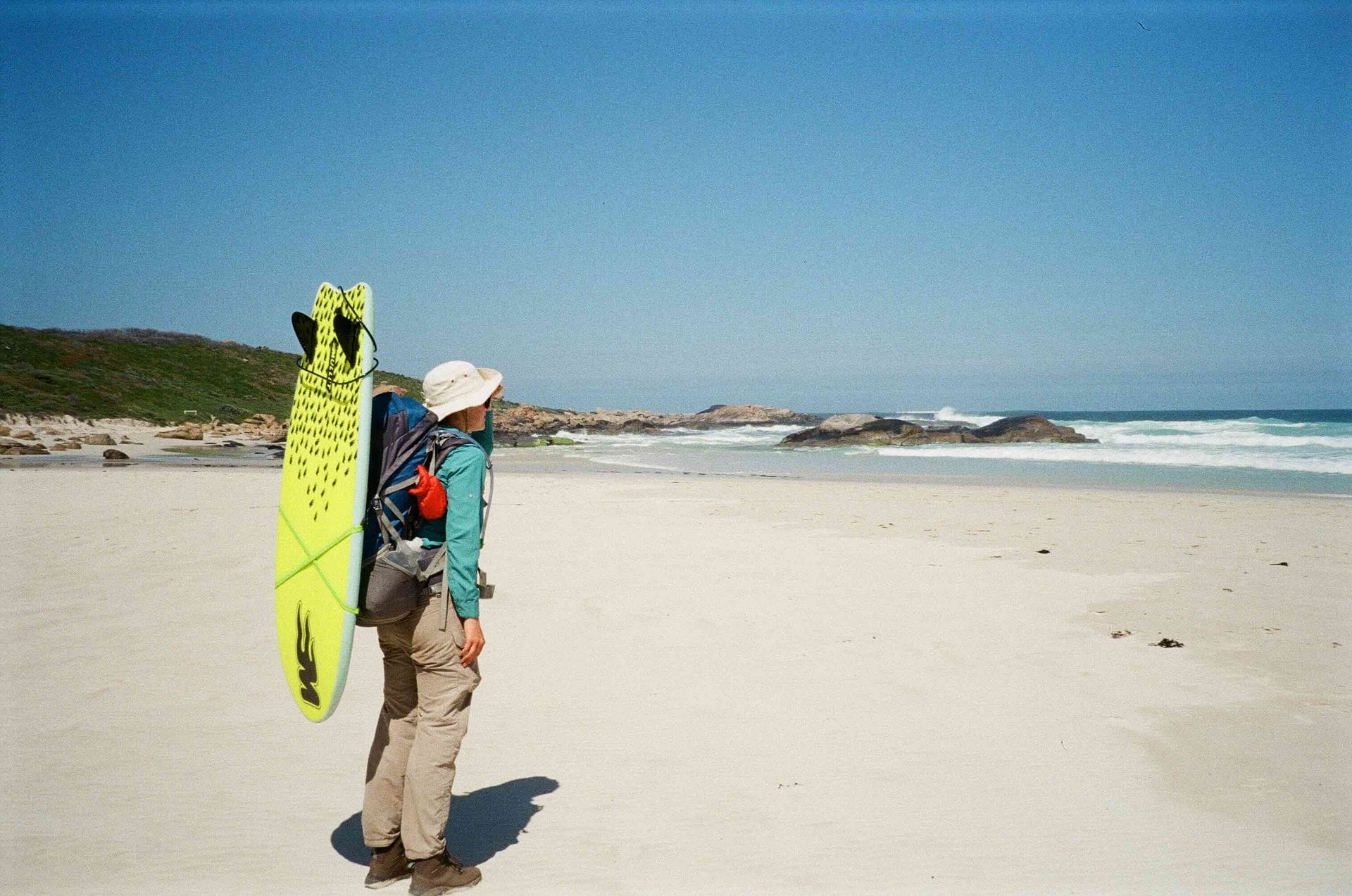 Redgate Beach, Western Australia, by Amber McBride, surfboard, hiking gear, trekking poles, backpacks, boots, wetsuit, sand, Cape to Cape Track, surf-hike adventure, SurfAid