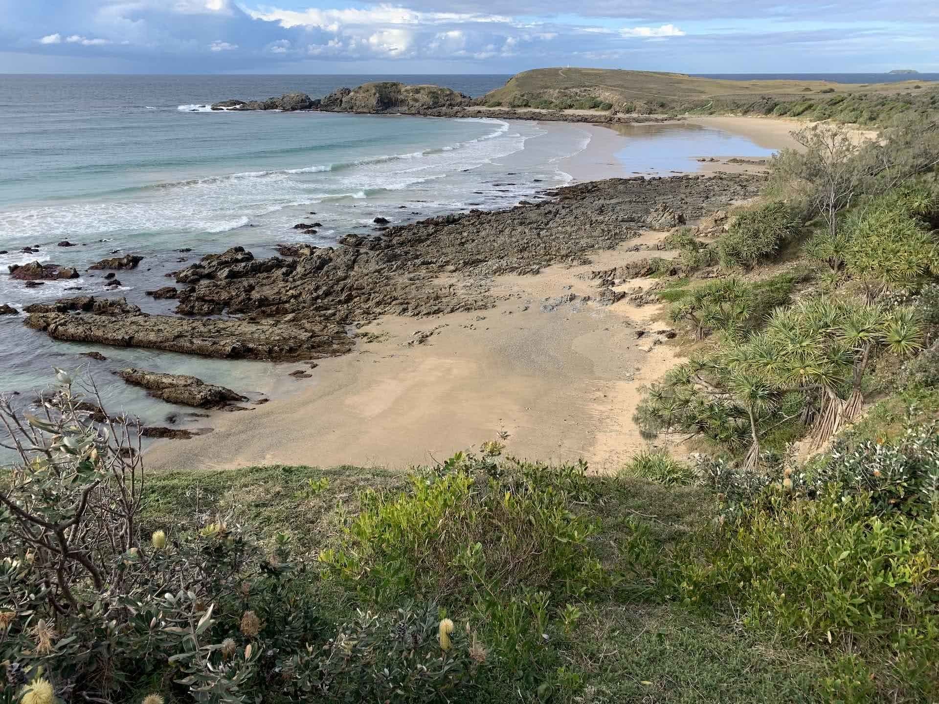 We walked on to Shelly Beach and at the end of the long beach, rocky cliffs enclosed the sand. Apparently at low tide there are sea caves to explore, but the tide was coming in by the time we arrived, so we scrambled up the cliffs to the headland where there’s a picturesque campsite on the other side.