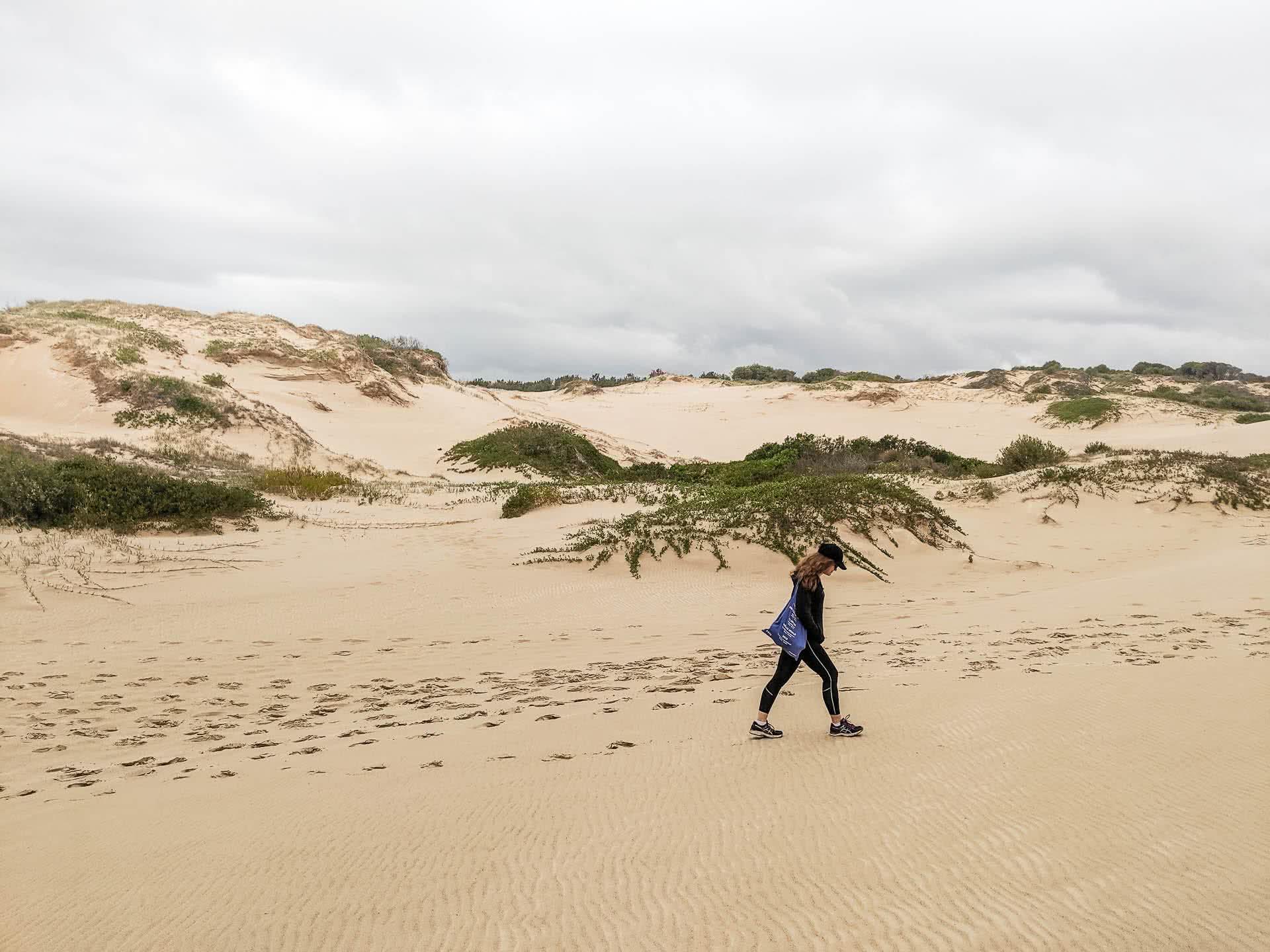From the car park, the walking trail disappears almost immediately, replaced with towering sand dunes and scrubland. Heading somewhat straight you’ll hear the waves on your left and catch glimpses of the beach as you climb up and over the dunes (easier said than done!). We were lucky that it had rained overnight, so the dunes were a little more solid to hike up than usual.