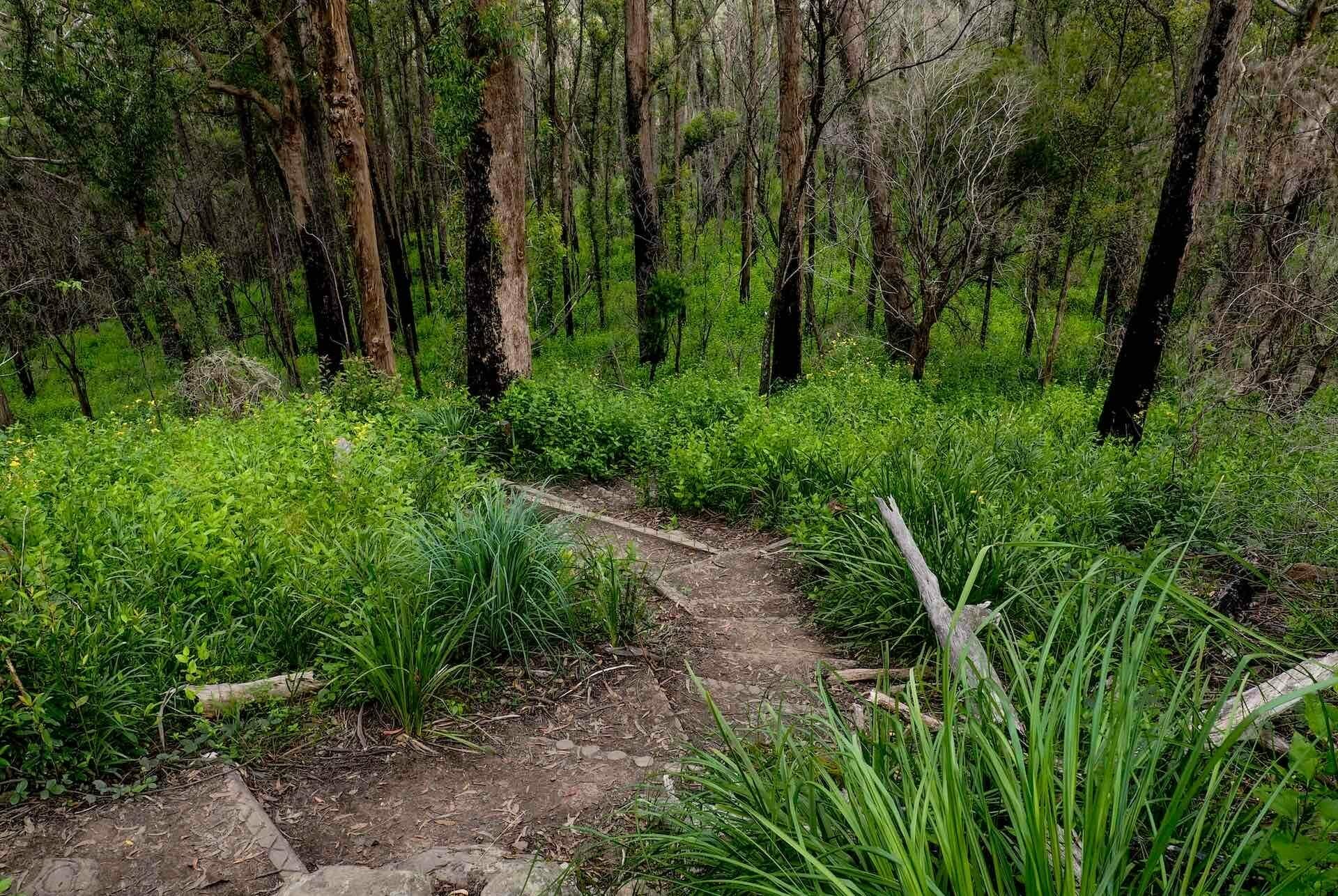 The hike starts off with a gradual switchback climb and passes by eucalyptus trees charred in the 2019 bushfires, now draped in regrowth.
