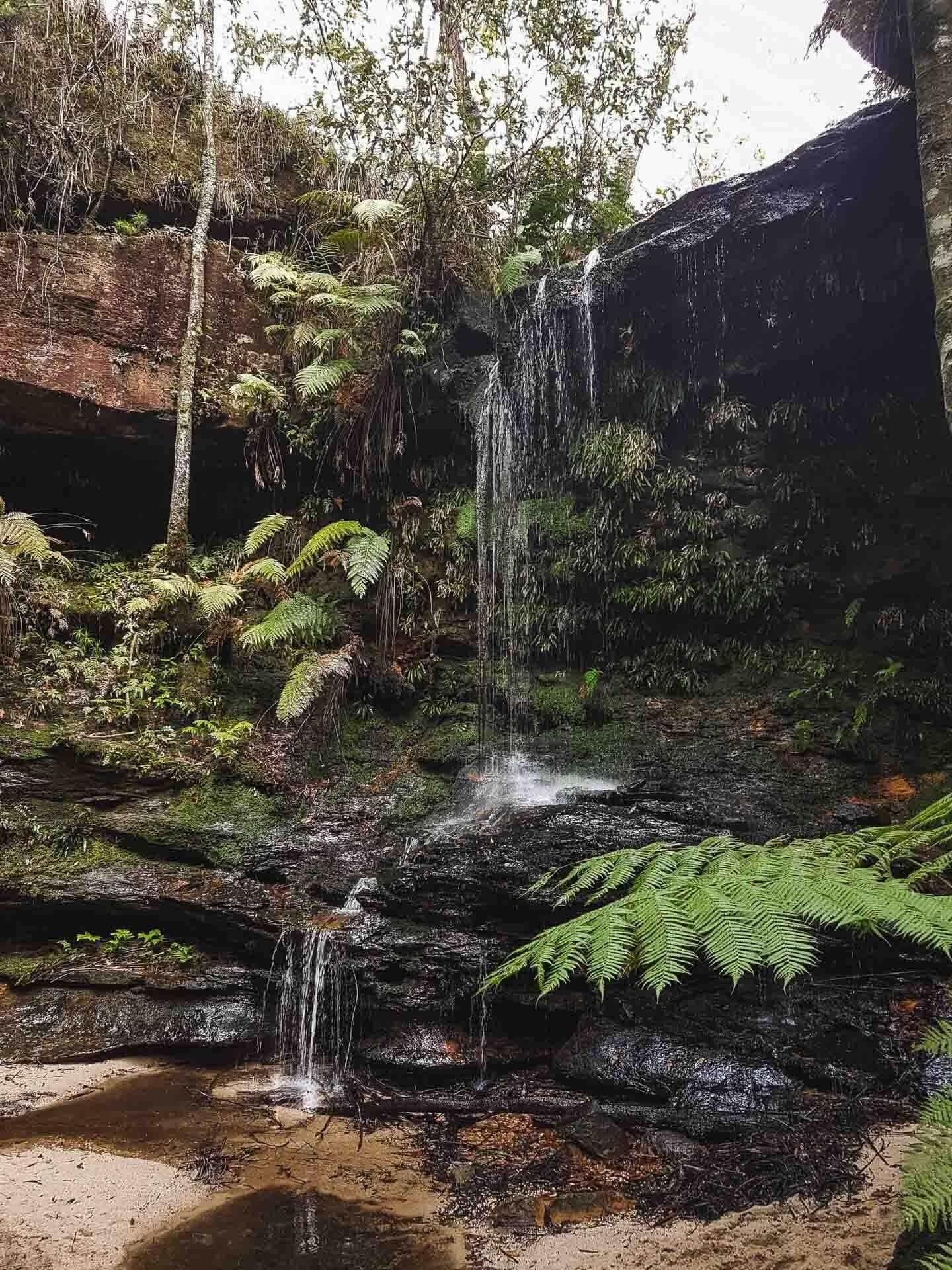 The track itself meanders up and down through the damp lush forest, crossing Hazelbrook Creek and bringing you to the top of Horseshoe Falls, where you can carefully peer down over the rock platform to where the falls pool below. Horseshoe Falls features a shallow cave behind it which is begging to be explored. The moss-covered rocks are quite slippery, so take care.