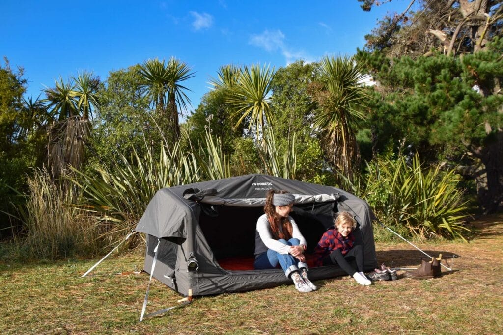 The Dometic Pico FTC 2 TC boasts some great features, for example the option to use the included poles to turn the entrance into a canopy, which can be set up at different angles. The swag is made from Weathershield™ TC, a durable technical cotton material that’s fully weatherproof and reduces condensation. With the Kā Tiritiri o te Moana/Southern Alps just up the road, it was literally freezing when we used the Dometic Pico FTC 2 TC, but we were warm, dry, and cosy all night.