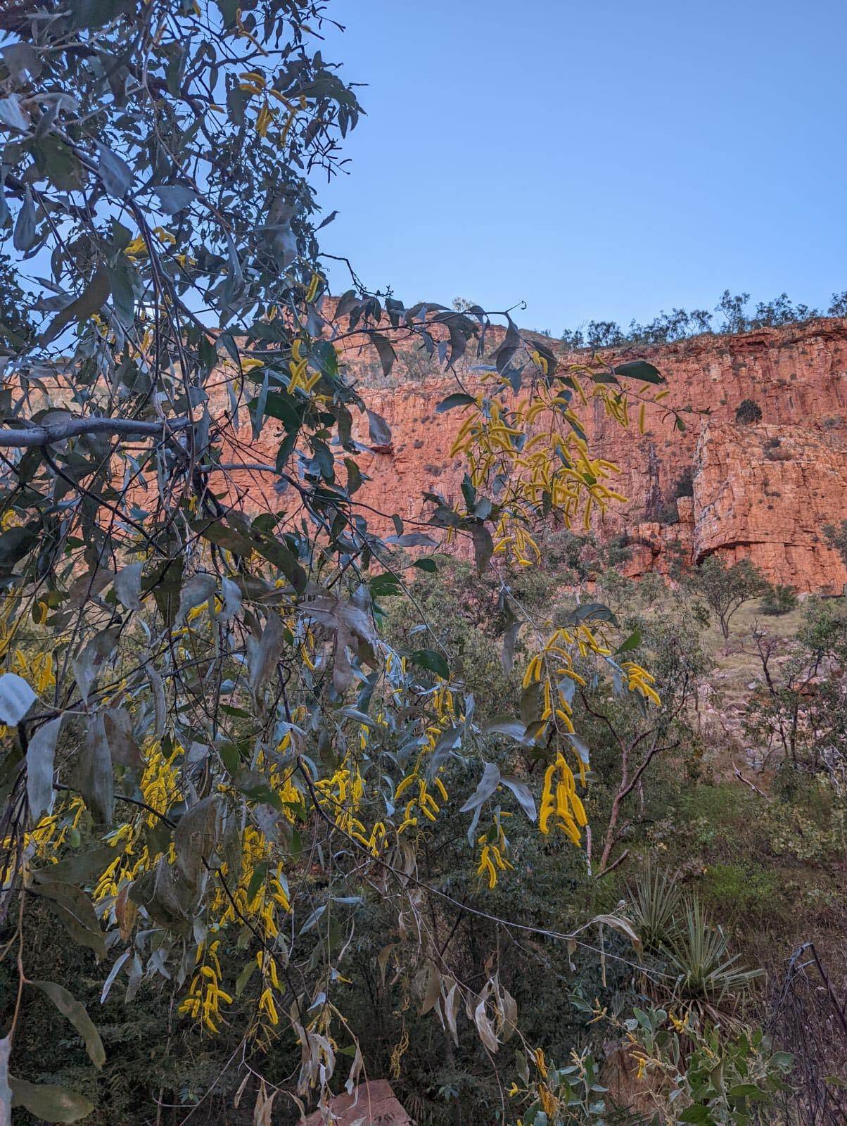 As you walk, you’ll rock hop across the creek a few times, scramble up boulders, and maneuver around the native flora that floods the gorge floor. The sunny yellow blossoms of the () tree are a standout!