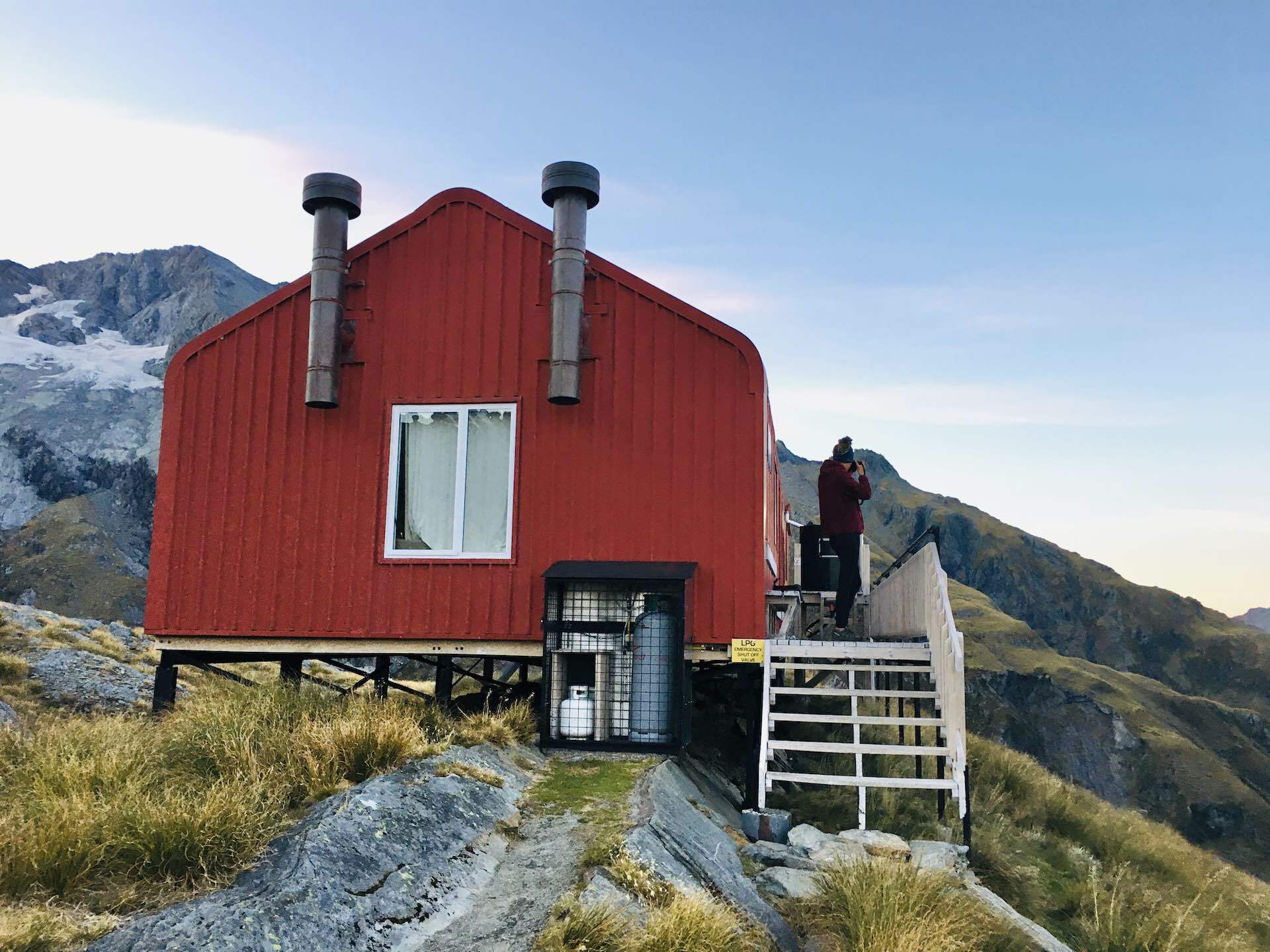 We walked another half hour or so up the tussocky steep hill, playing a game of categories to distract the legs, before arriving at our destination. French Ridge Hut. The little red hut with the cutest red loo on planet Earth.
