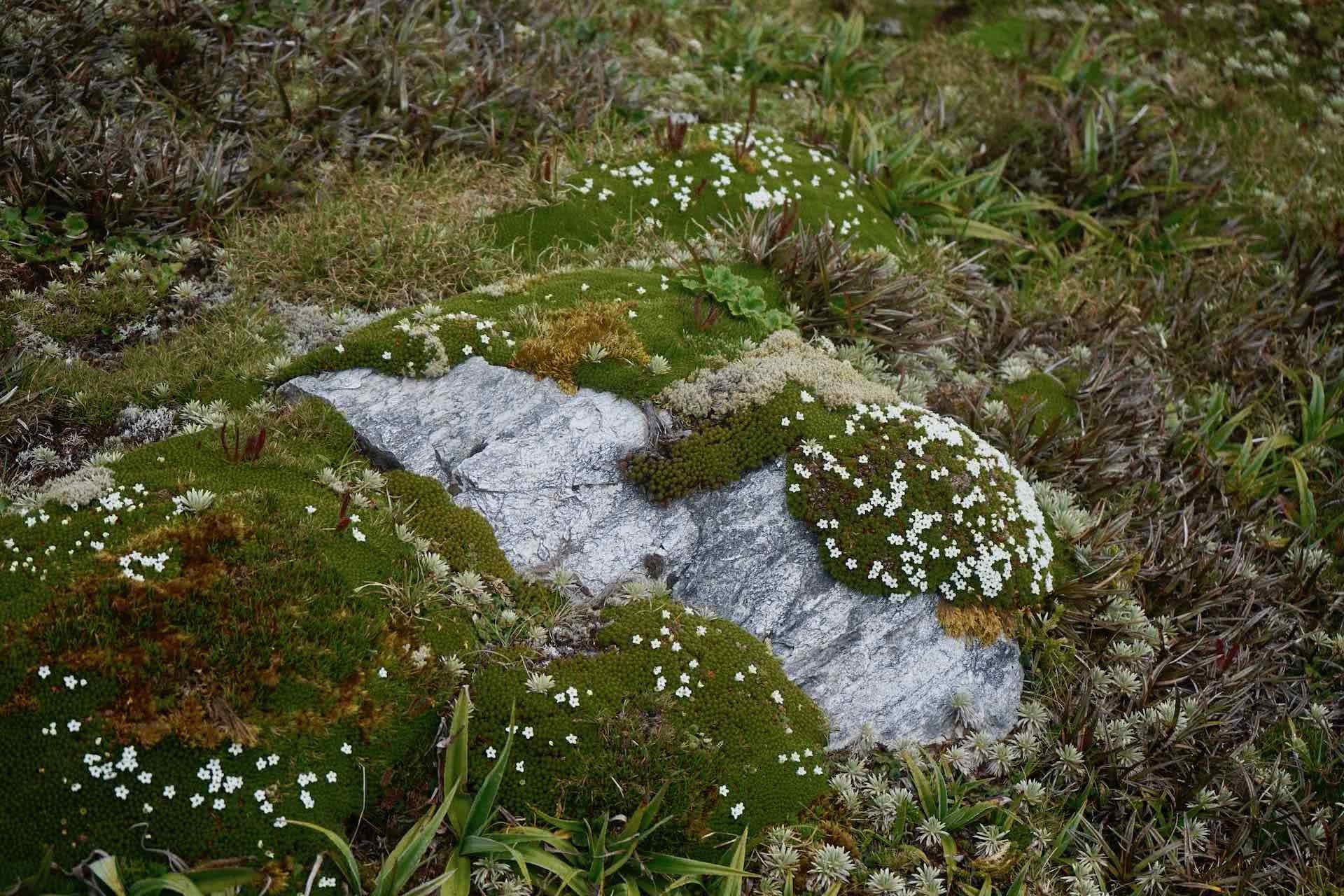 Though the sun was still shining brightly, we knew that cloud cover and potential rain was coming our way, so we set a fast pace up the steep rocky track to the summit. Larger white quartz boulders form most of the path, and fascinating microclimates of cushion plants and tiny wildflowers remarkably make their home further up the mountain.