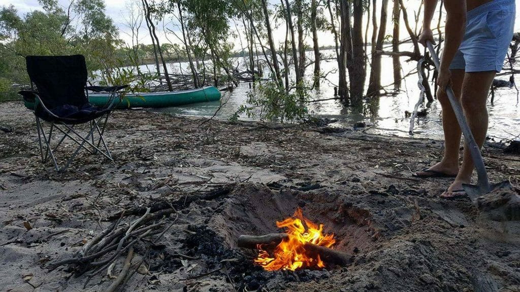 Preparing a campfire by the dam