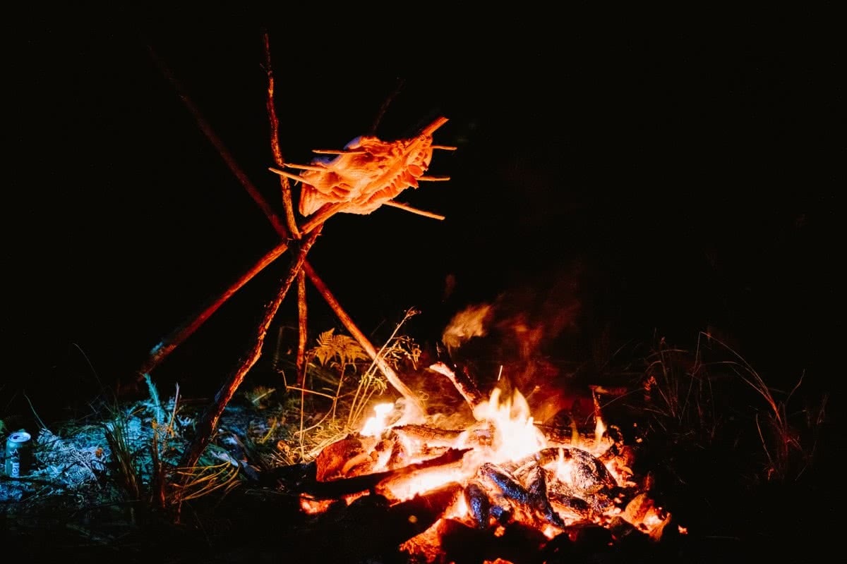 Then place the fish flesh side down over the fire using the tripod. The bottom of the split stick can be secured using a peg, boulder, log or similar.
