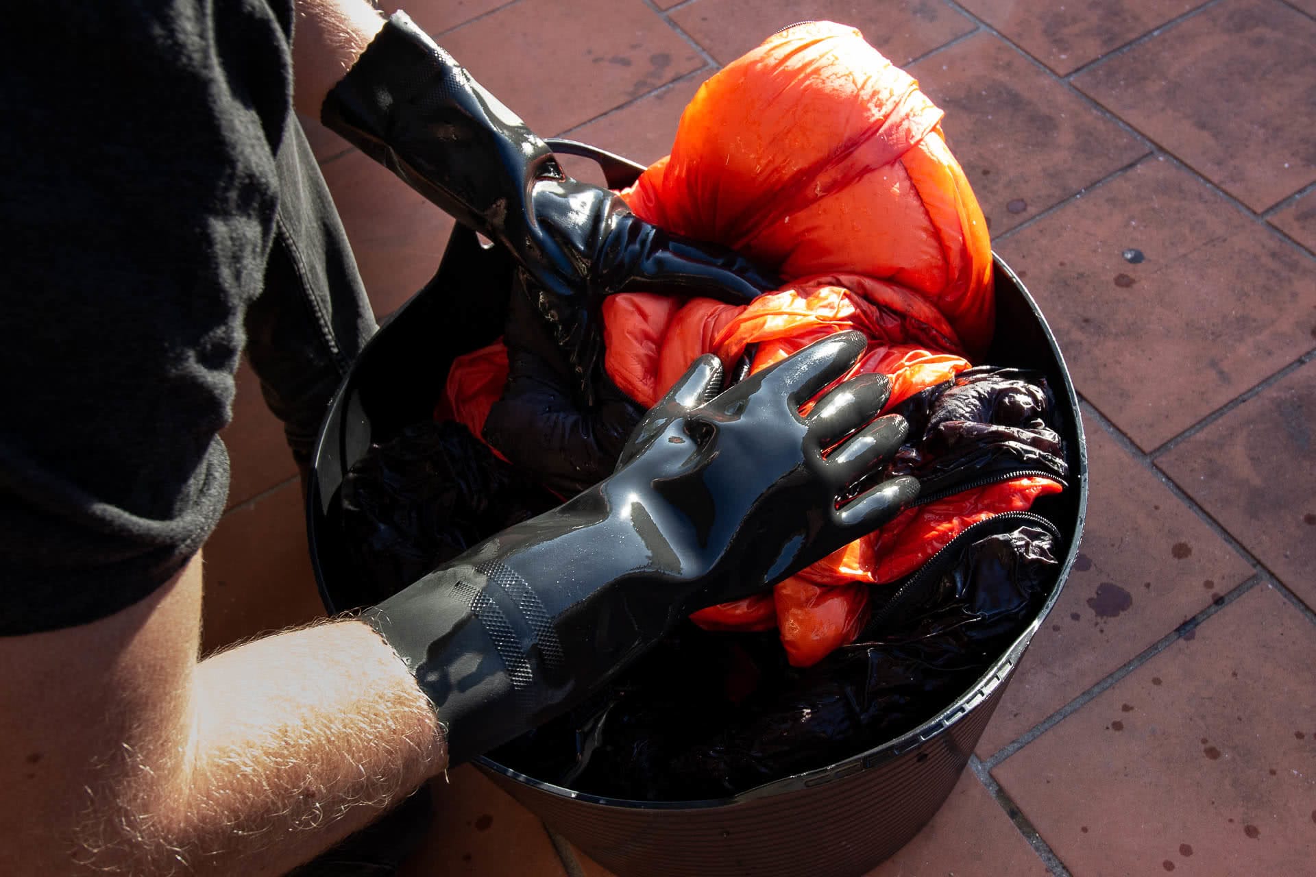 1. Put on gloves and slowly push the bag through the warm water to ensure even coverage.