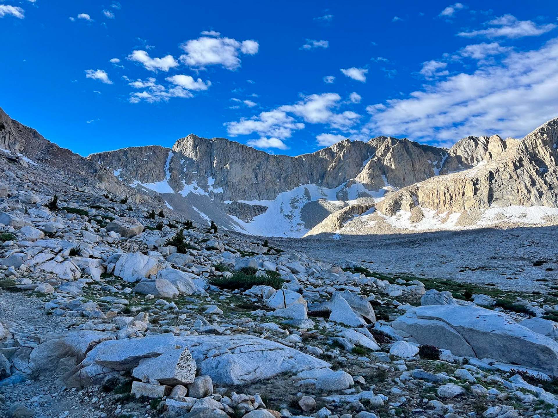 Today’s aim is to get to Upper Palisade Lakes before tackling Mather Pass the next day. The forecast is for cooler weather, high winds, and dust storms. I stow my bucket hat, swapping it out for a new tight-fitting bright orange baseball cap.