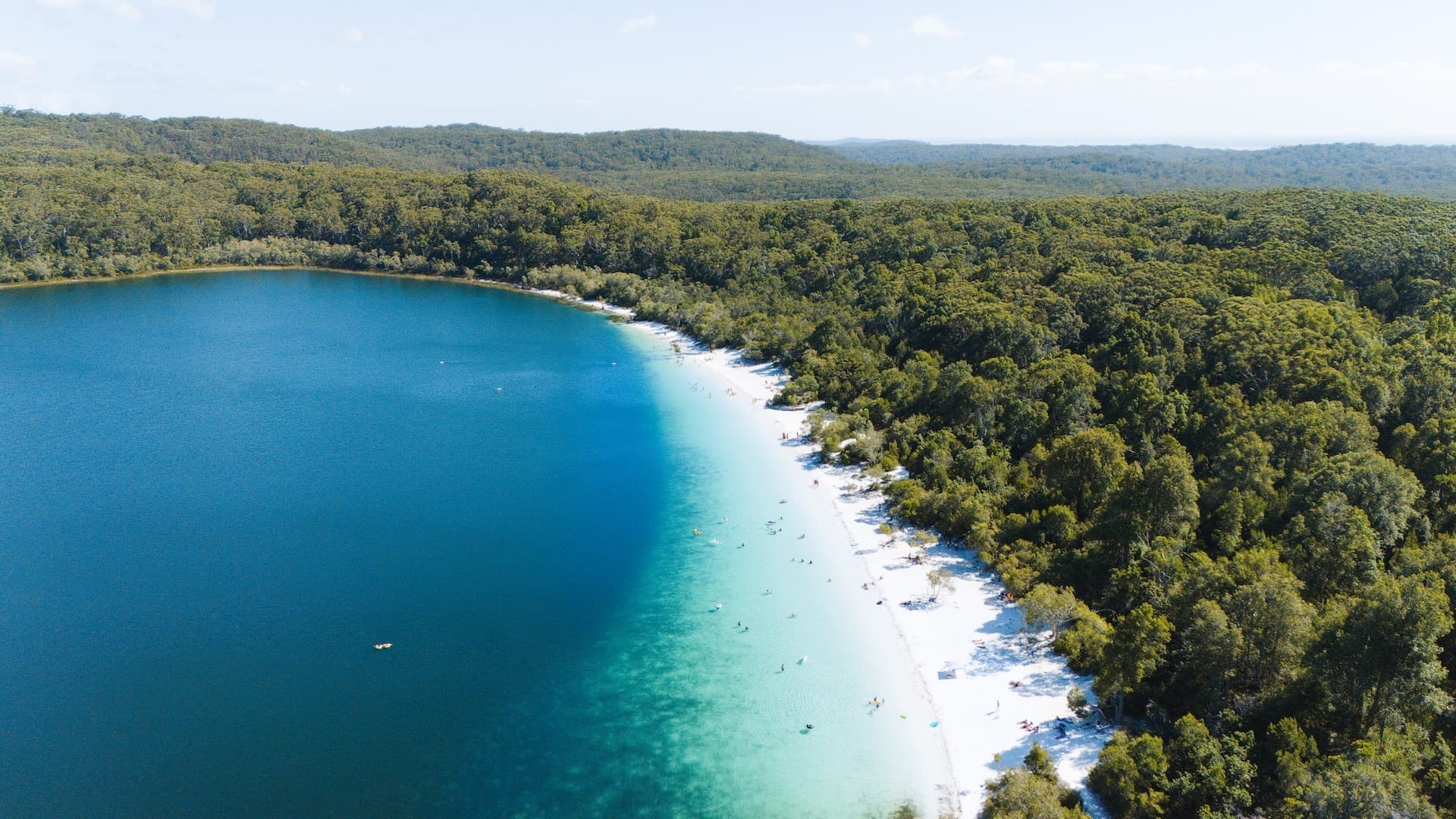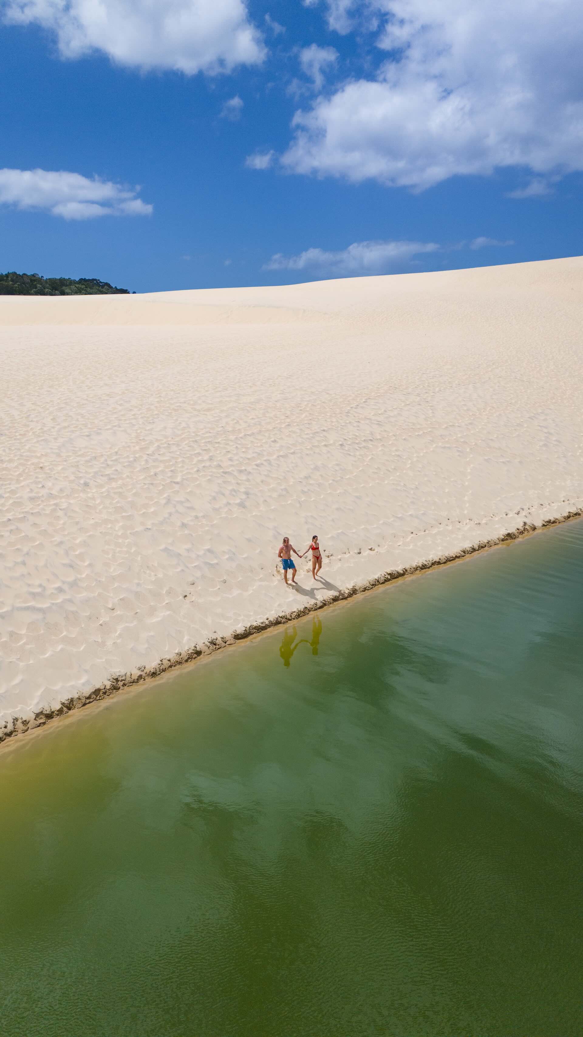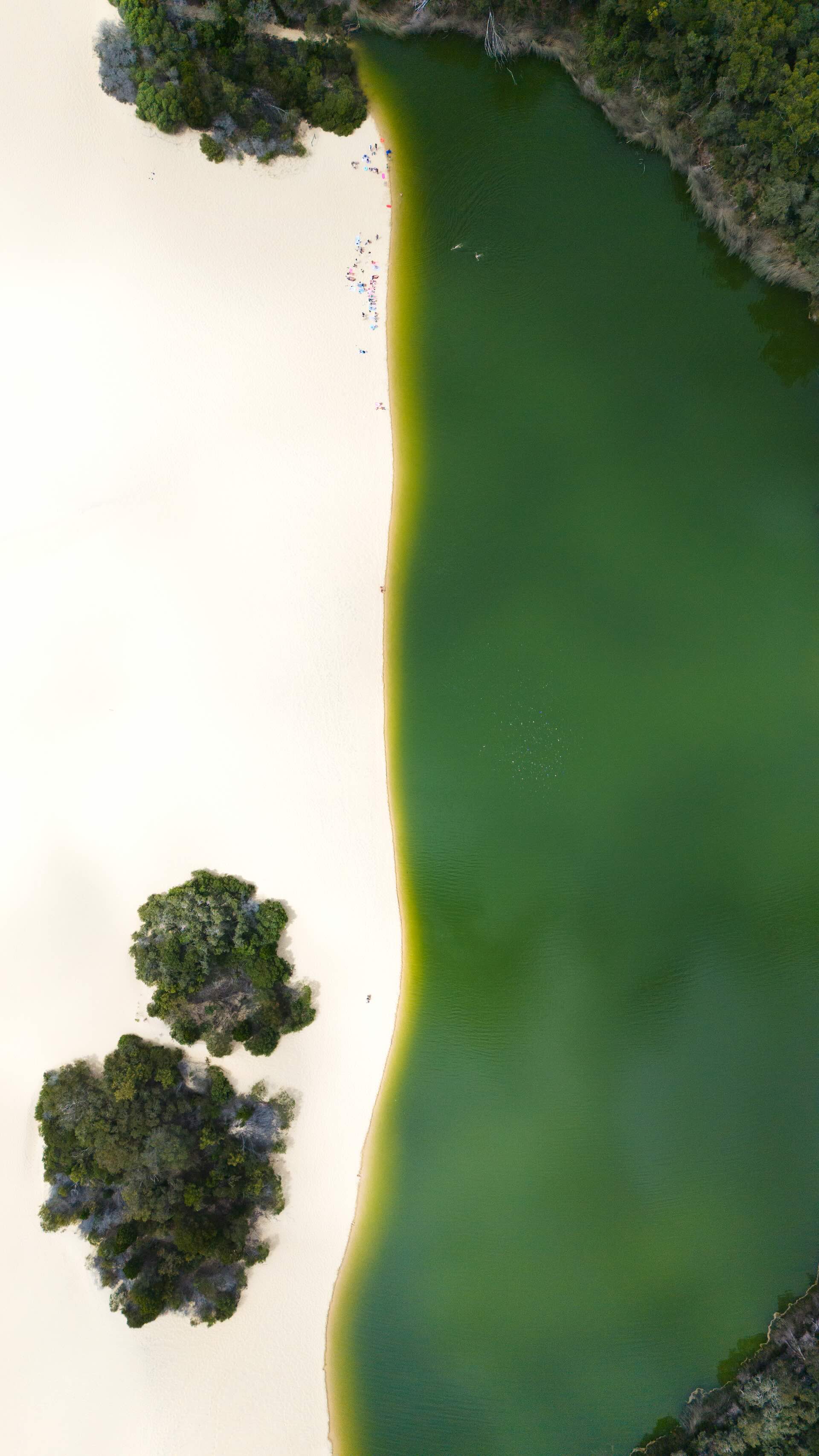 Often cited as the crown jewel of K’gari, we’ve saved the best for last. Tucked into rainforest, Lake McKenzie’s white silica sand fades from bright turquoise to deep navy as the bottom drops away to around 6.6 metres. It’s a perched lake, held above the water table in a basin, so the water’s rain fed and famously clear.