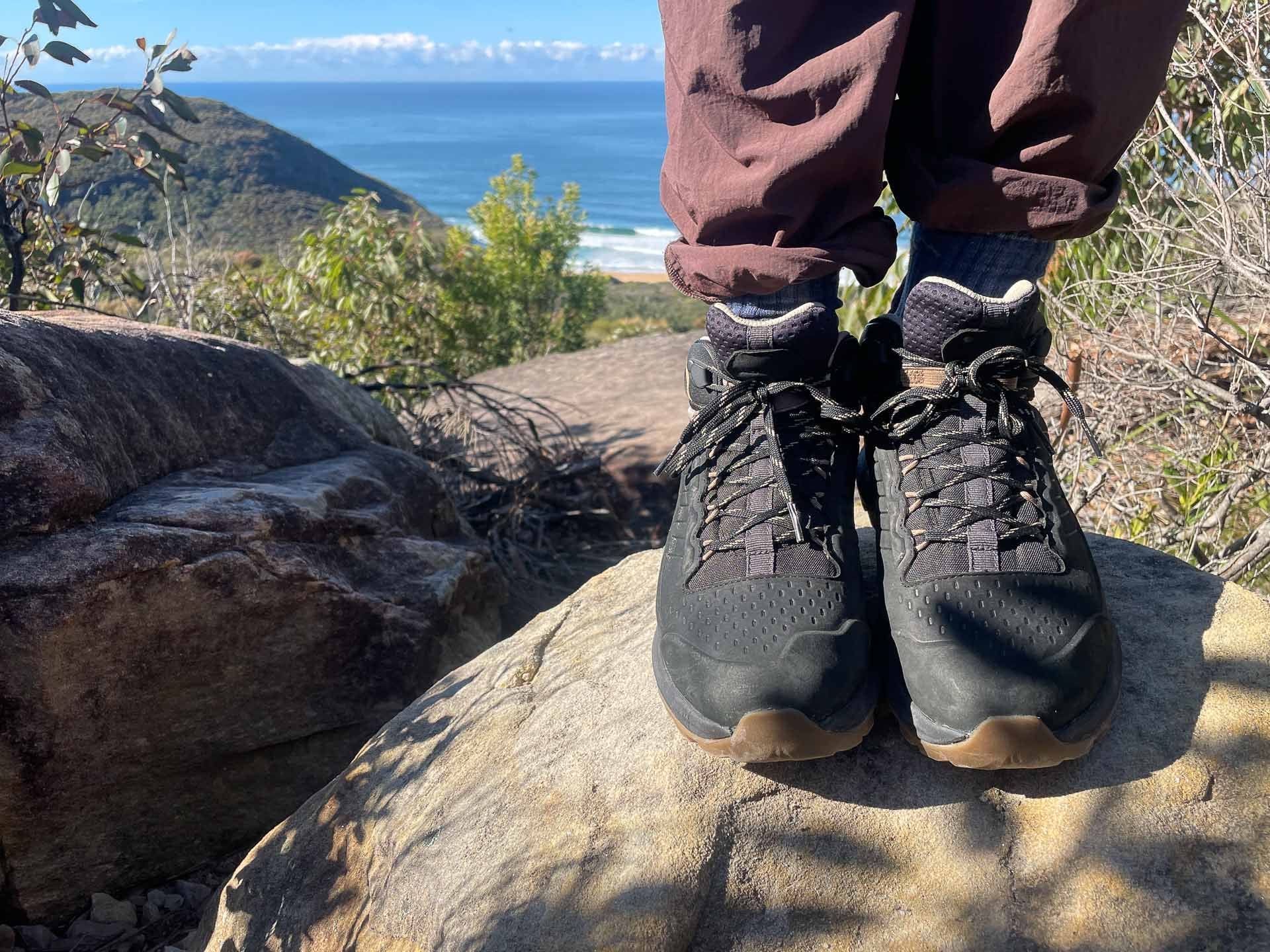 Merrell Moab Speed 2 Mid Leather Hiking Boots, by Explorer Julia, coastal hiking trail, ocean view, rocky terrain, Australian bush, outdoor adventure