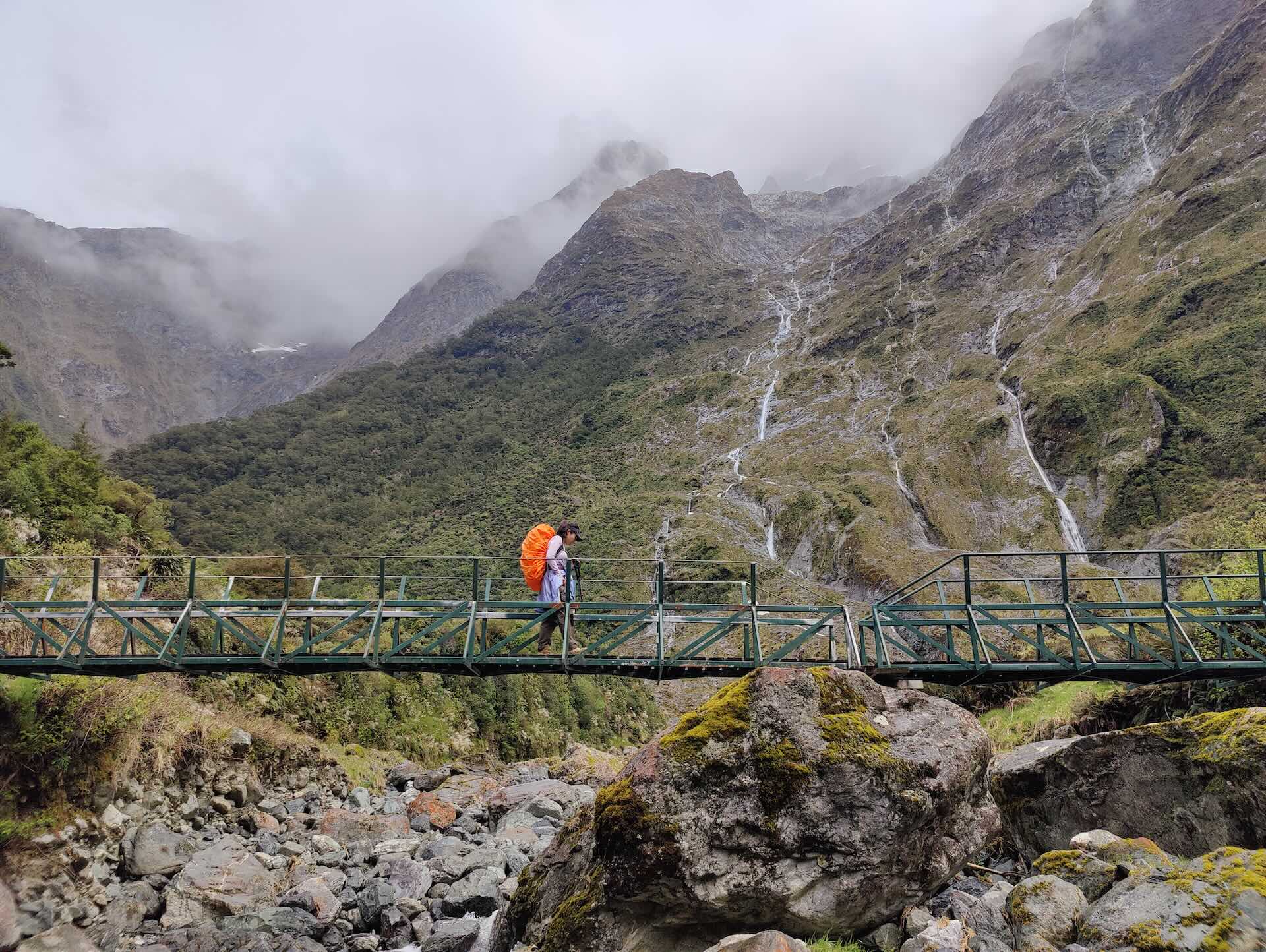 Our day was cloudy, limiting visibility and leaving my beard with an unending supply of water droplets. We paused for a short break at the pass, soaking up the scenes of other hikers posing for pics in this colour-washed reality, but  it was too cold to just sit around, so we pressed on to McKinnon Pass Shelter and made a cuppa. It was bustling with other hikers, all familiar faces from the previous two nights.