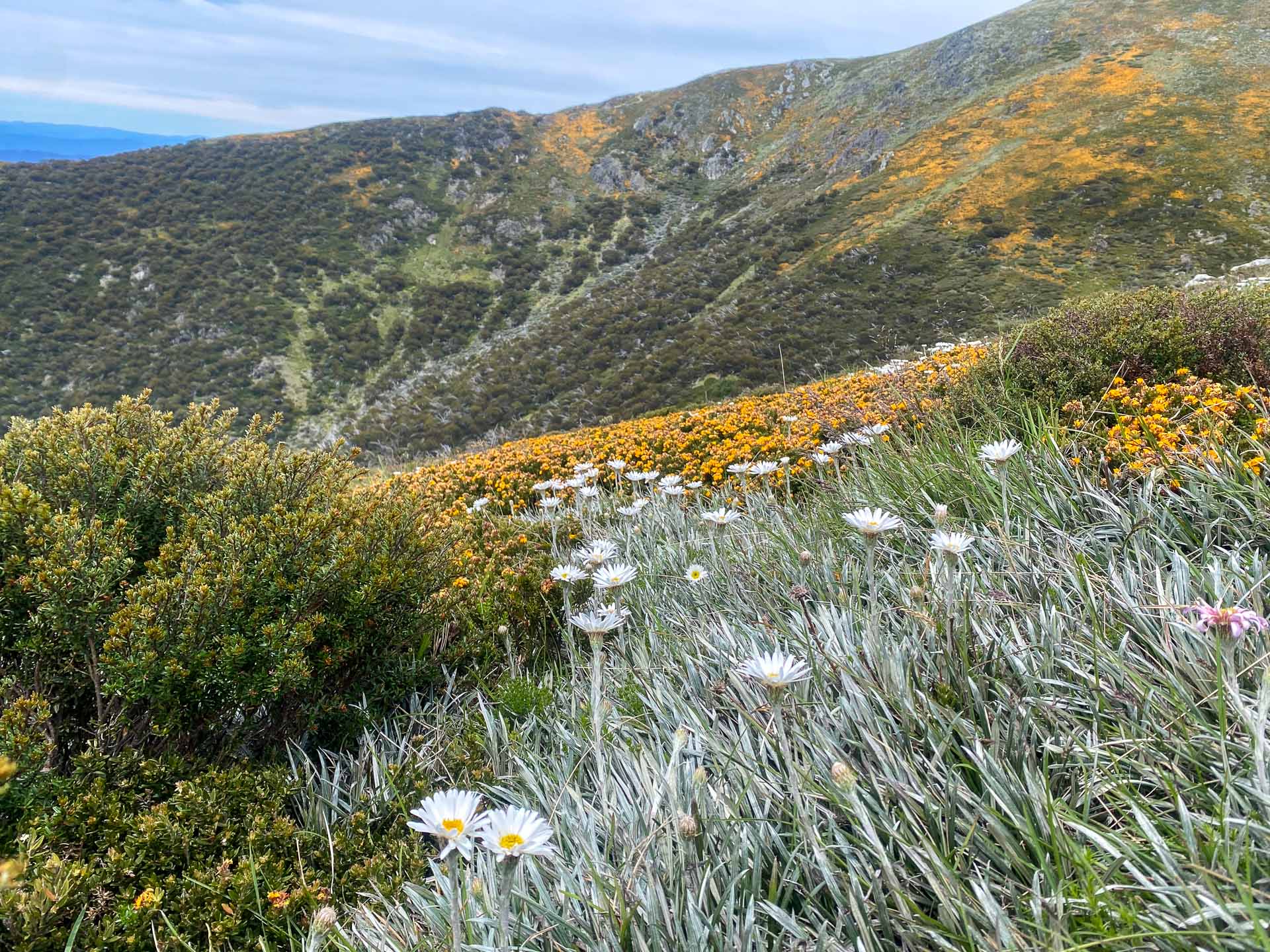 Finally, the trees dwarf and redden, and then I’m up on the plateau, surrounded by alpine Shaggy pea and Mint bush, Snow daisies, Billy buttons, Pink trigger plants, and countless other flowering plants that look like tiny living ornaments, carefully tended by the wind.
