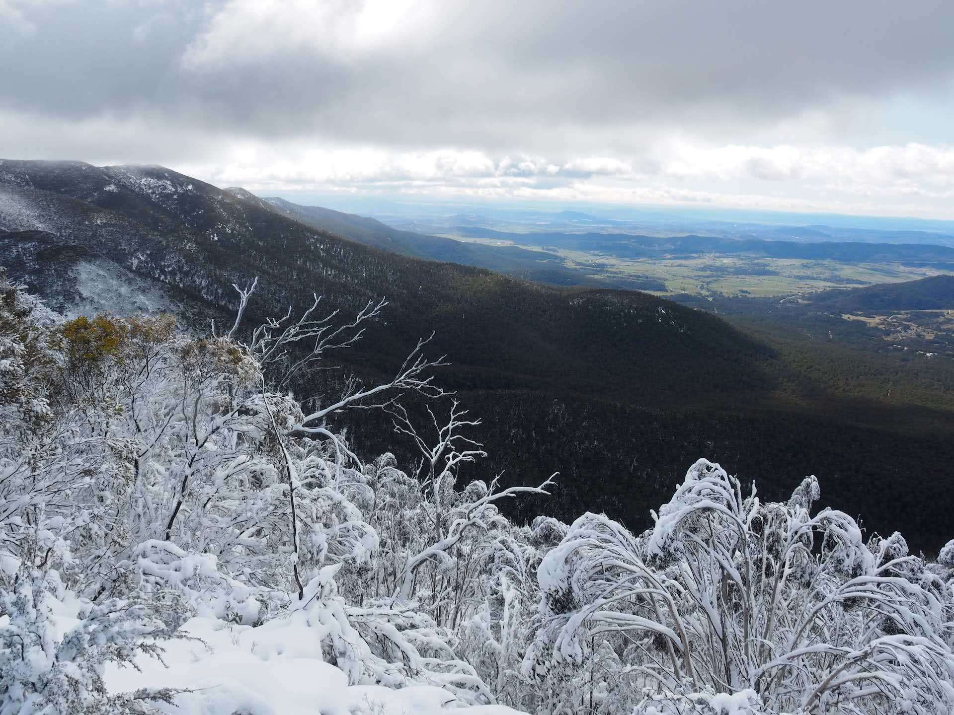The track was manageably steep, but difficult in the thick snow. After about 1.5km, we reached a plateau with sweeping views across Namadgi National Park. The snow was spectacularly contrasted against the burnt landscape.