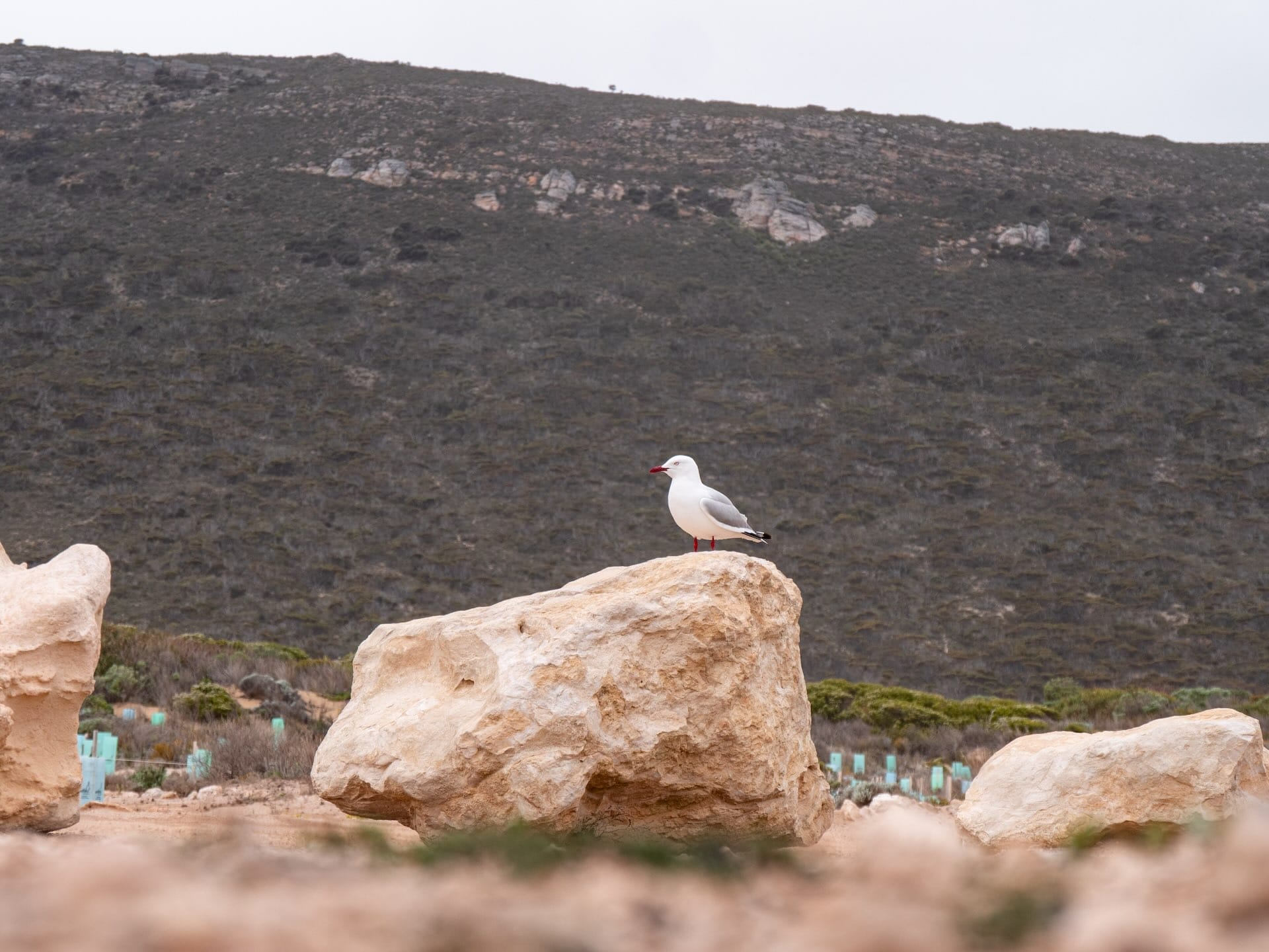 The route climbed easily enough, then stiffened sharply, mallee thinning to stunted blue bush, gusts whipping across the open slopes. A jumble of lichen-streaked boulders served as an early windbreak, with views fanning to the northern promontory of the distant Coffin Bay National Park.