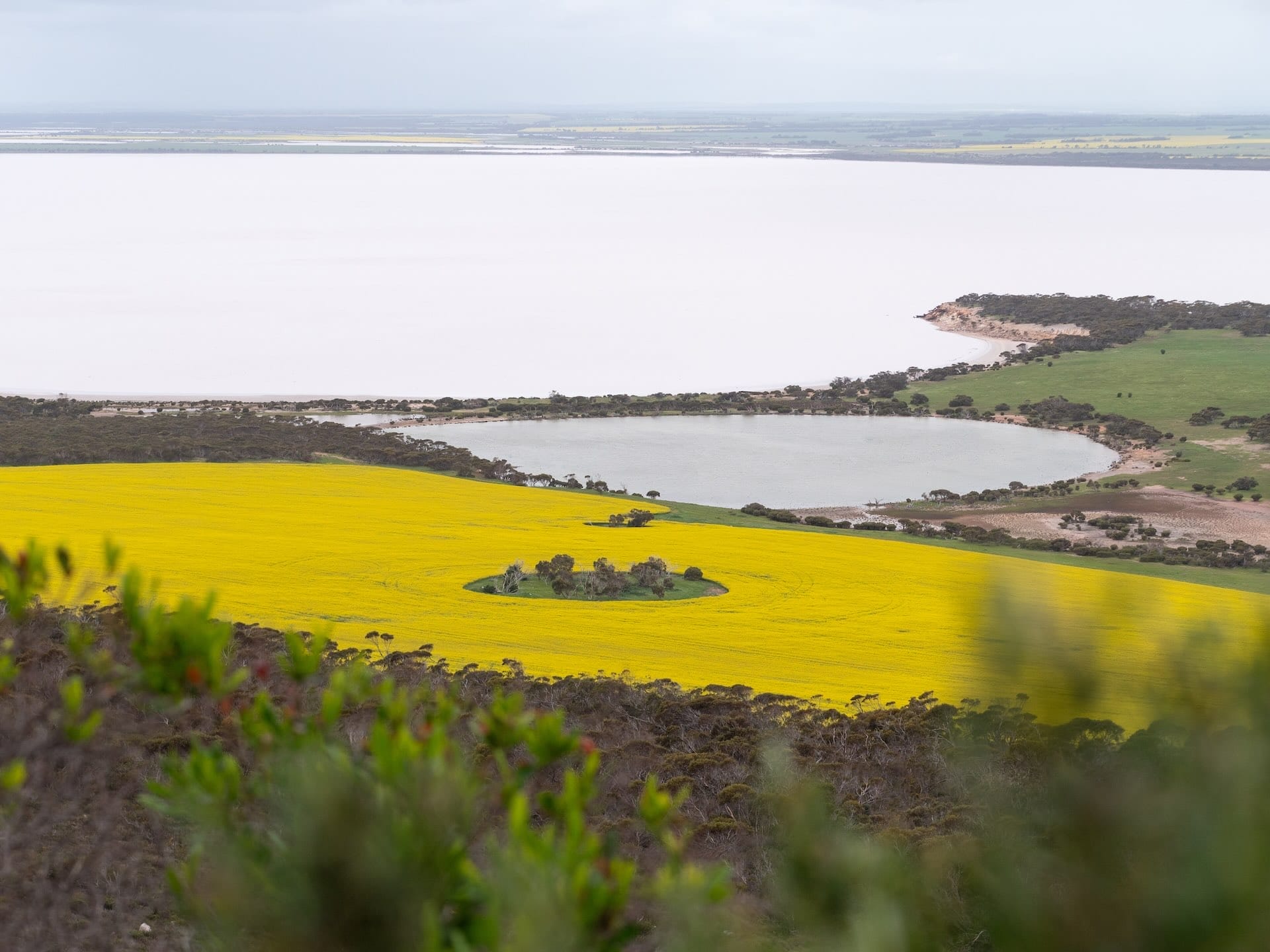 The next 300 metres morphed into a brief, jagged scramble, hands gripping rough granite as my feet shuffled for purchase. The route dipped to the mountain’s leeside, away from the lash of coastal wind, revealing views of Puwanna/Lake Greenly, its pale waters swamping the patchwork of canola and wheat.