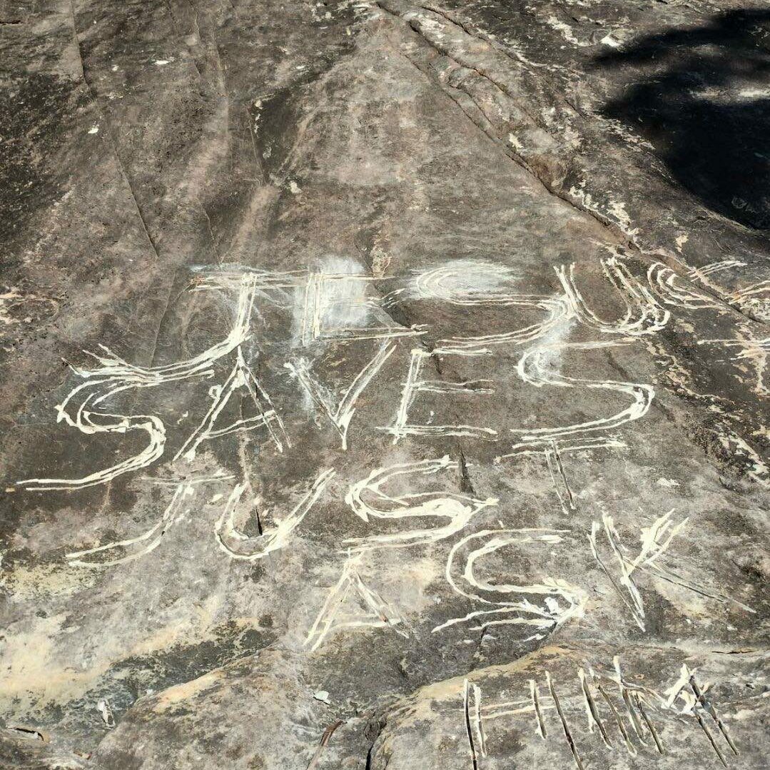 The words ‘Jesus Saves Just Ask Him’ have been carved into the rock, in some sections as deep as two centimetres, with what’s believed to be a power tool.