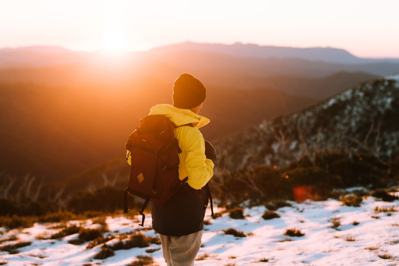 First-Time Alpine Hiking On Mt Buffalo (VIC) by Cedric and Melody Tang, XTM Performance jacket, sunset in the snow, backpack