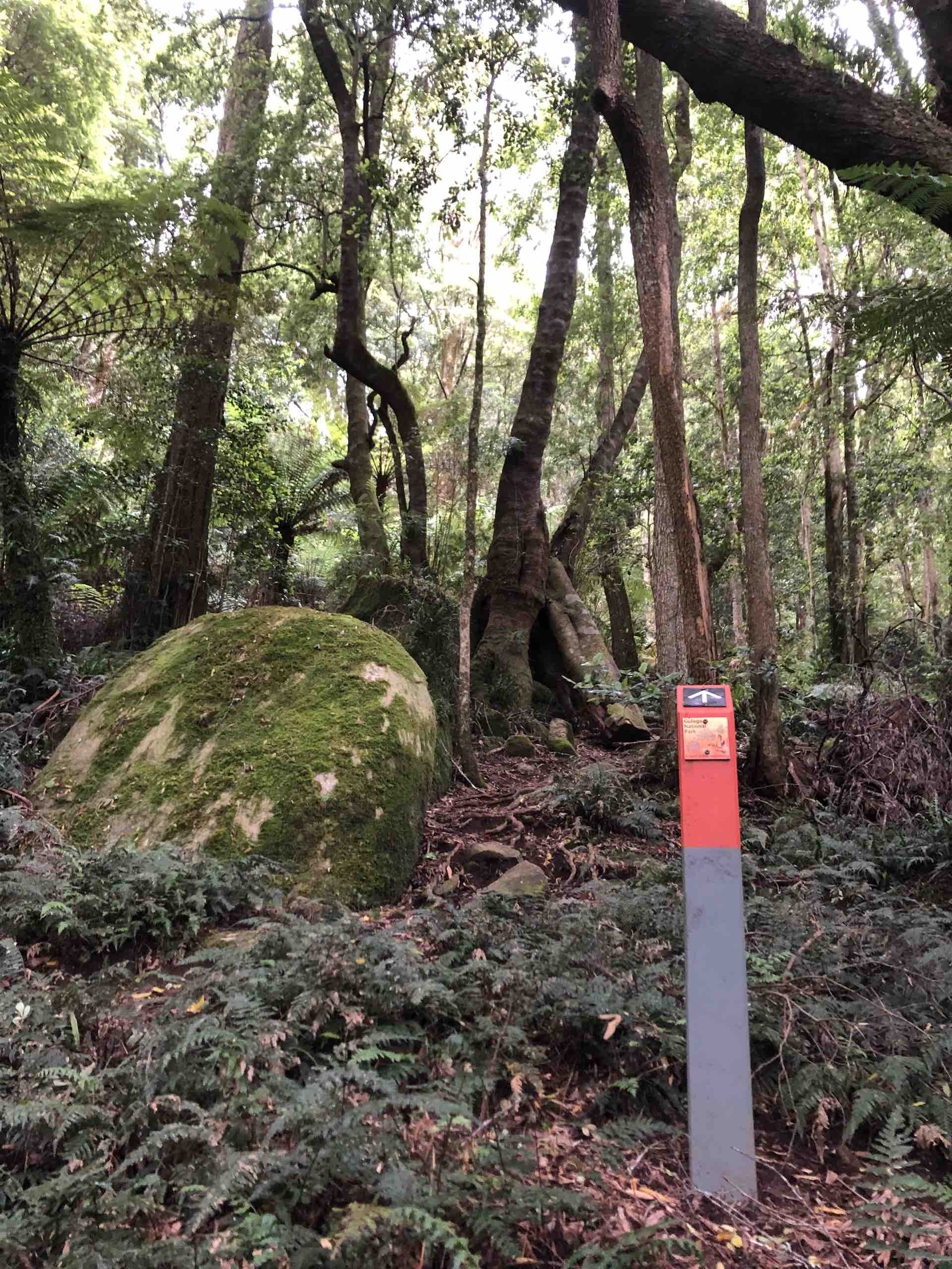 A drop toilet and a picnic table signal your arrival at the saddle. There’s an information display detailing the significance of the mountain to the Yuin people who call this area home. Mt Gulaga is considered the birthplace of the Yuin Nation, with Dreaming stories explaining its maternal role in relation to people and other nearby landforms such as Didthul (Pigeon House Mountain).