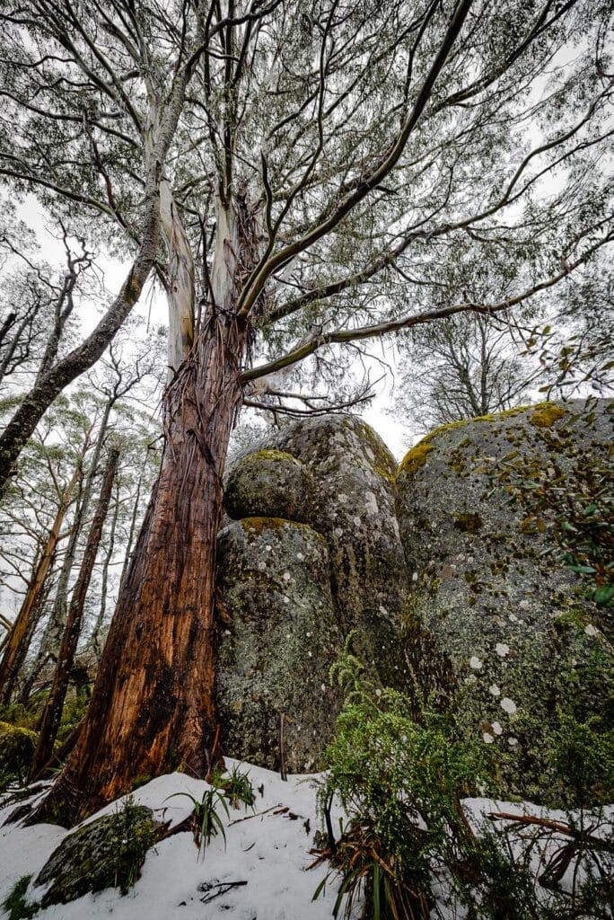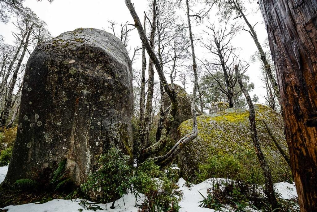 The change from rainforest to alpine vegetation was like a line in the sand. Snow gums protected me from the drizzle that was beginning to set in over the mountains. Granite boulders began to border the track, as did the cold white stuff on the ground.