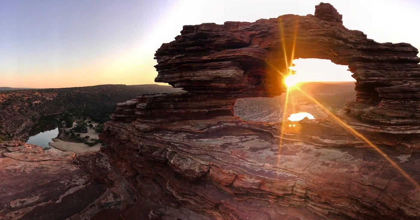 Sunrise At Nature’s Window // Kalbarri National Park (WA), Tiffany Hulm, river, person ,lookout, view