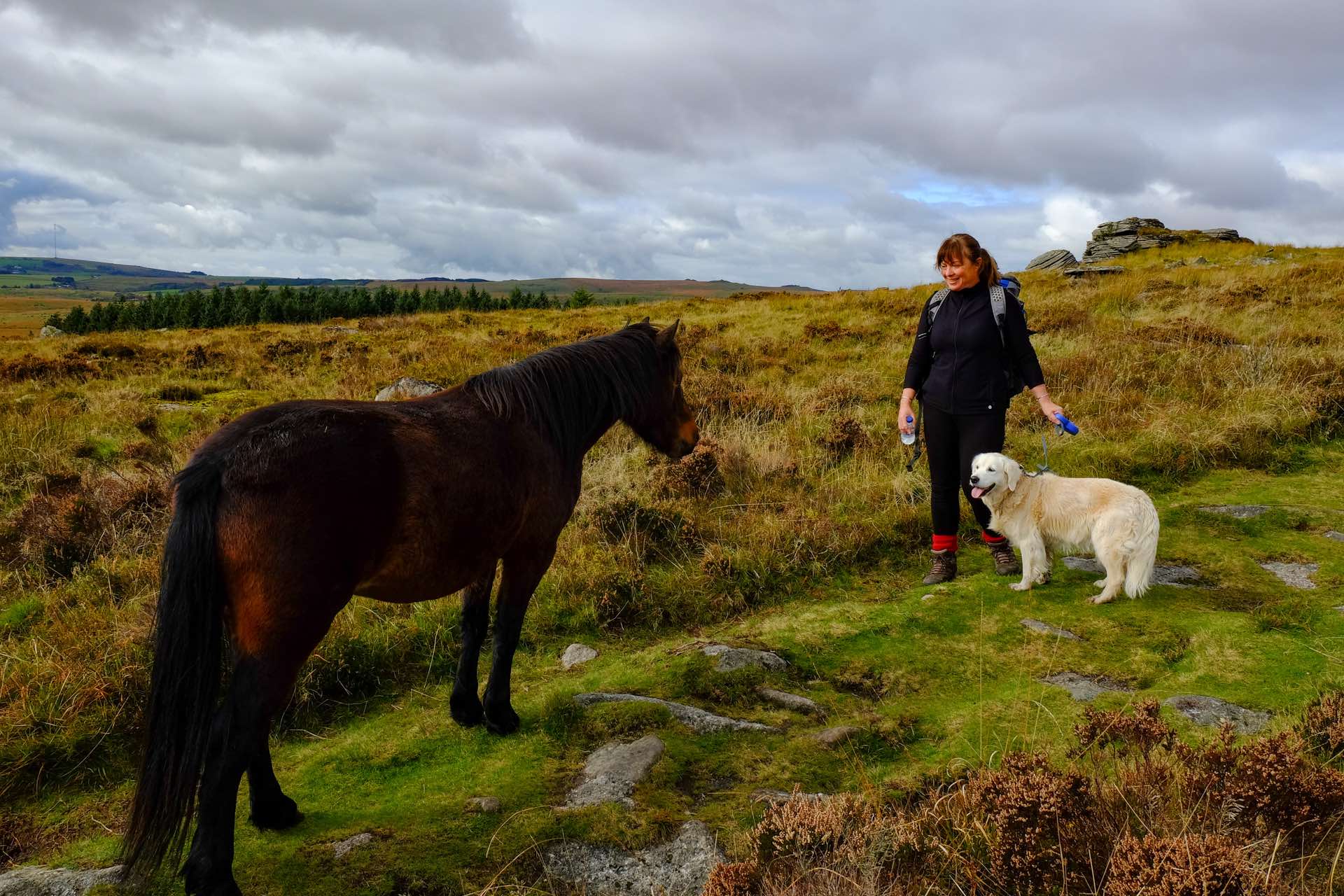 One day, in the distance we spotted horses. These turned out to be Dartmoor ponies, a famous and much-loved heritage breed, the numbers of which have decreased from around 30,000 to 1,500 today. Michael took photos of them from a distance, slowly getting closer and closer, until we were close enough to pat them. Turns out the ponies aren’t afraid of people, and they were fascinated by Bella. In the end, the pony and Bella were sniffing each other.