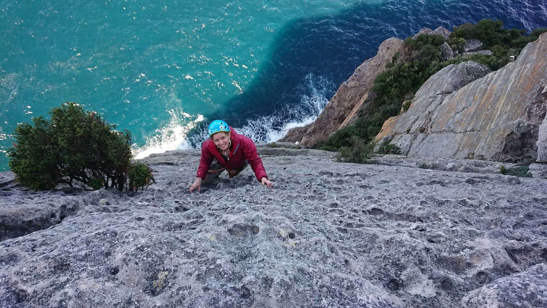 An Instagram classic, this route follows an arete jutting out to sea. It’s in the Red Riding Hood area, right near the lighthouse.