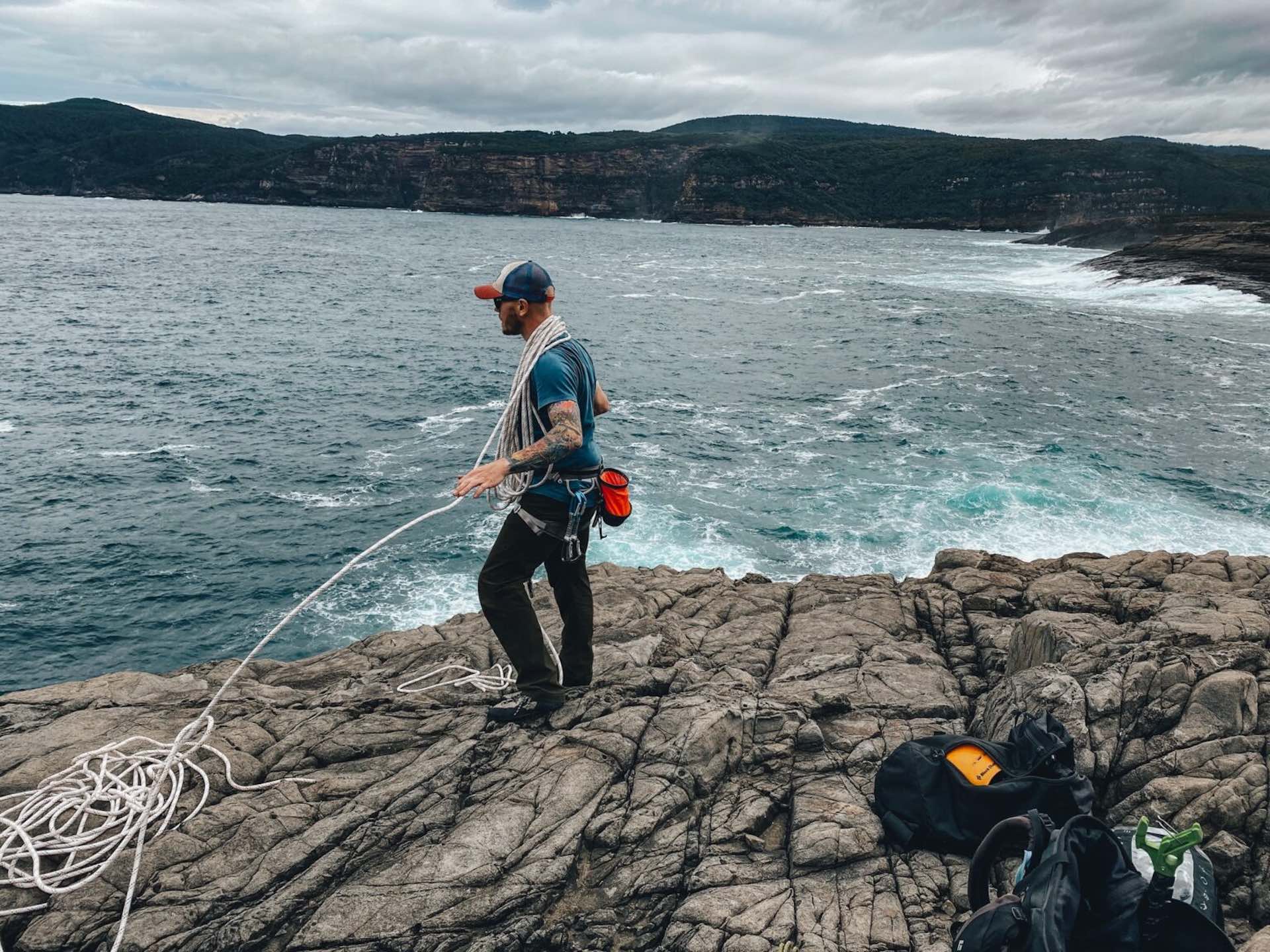 In terms of grade and approach, The Moai is the most accessible of the iconic Tasmanian sea stacks. Don’t let that fool you though – it’s still a huge day full of adventure! It’s important to do your research to find out what it takes to get to the climbs and back to the campsite, even better if you can tap into local knowledge or be accompanied by someone who has climbed The Moai before. The best place to stay is at the Fortescue Bay camping area, from which it’s about a 7km hike to the cliff top above The Moai.