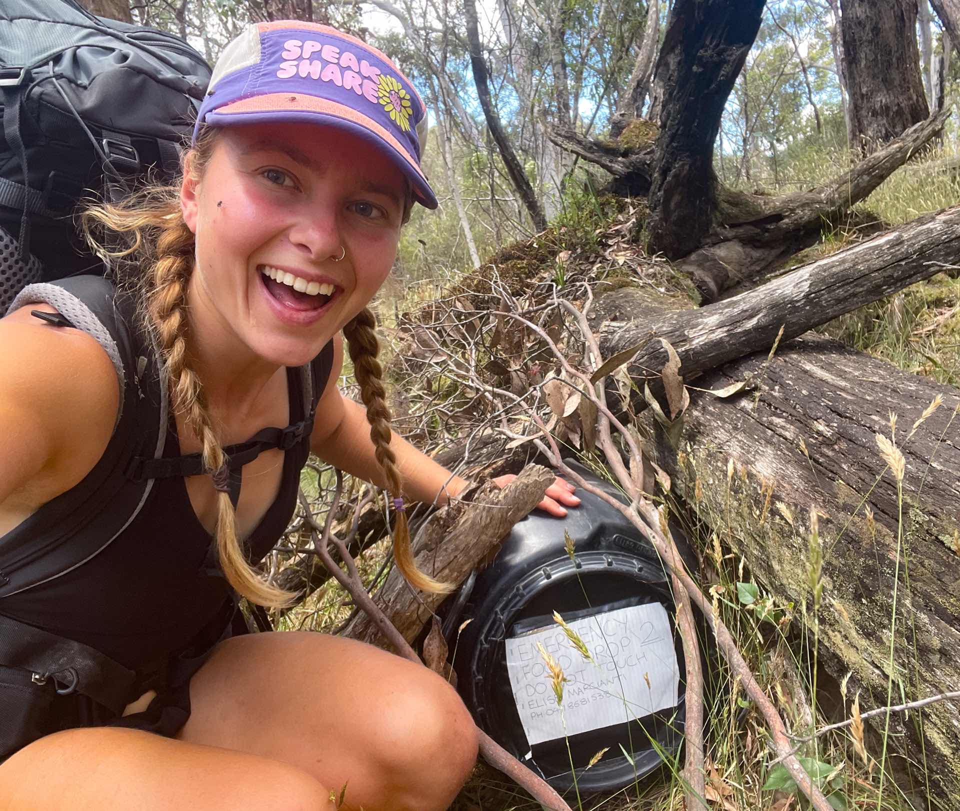 My Solo Hike for Mental Health Along 330km of the Aus Alps Walking Track, Photo by Elise Marcianti, food drop, food tub, hiker, smiling