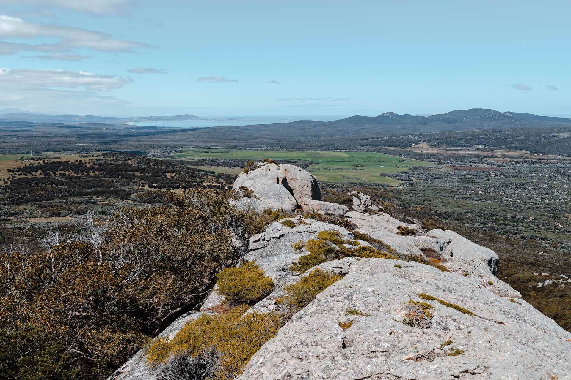 After walking past a handful of impressive granite boulders, you’ll find yourself in shaded bushland at the base of the mountain. This gradually climbing section of the trail takes you through bracken ferns and eucalyptus forest before it starts climbing more steeply. The incline starts quite suddenly, with the woodland giving way to a dense covering of low-lying shrubs, banksia, and native pines interspersed with open rock faces.