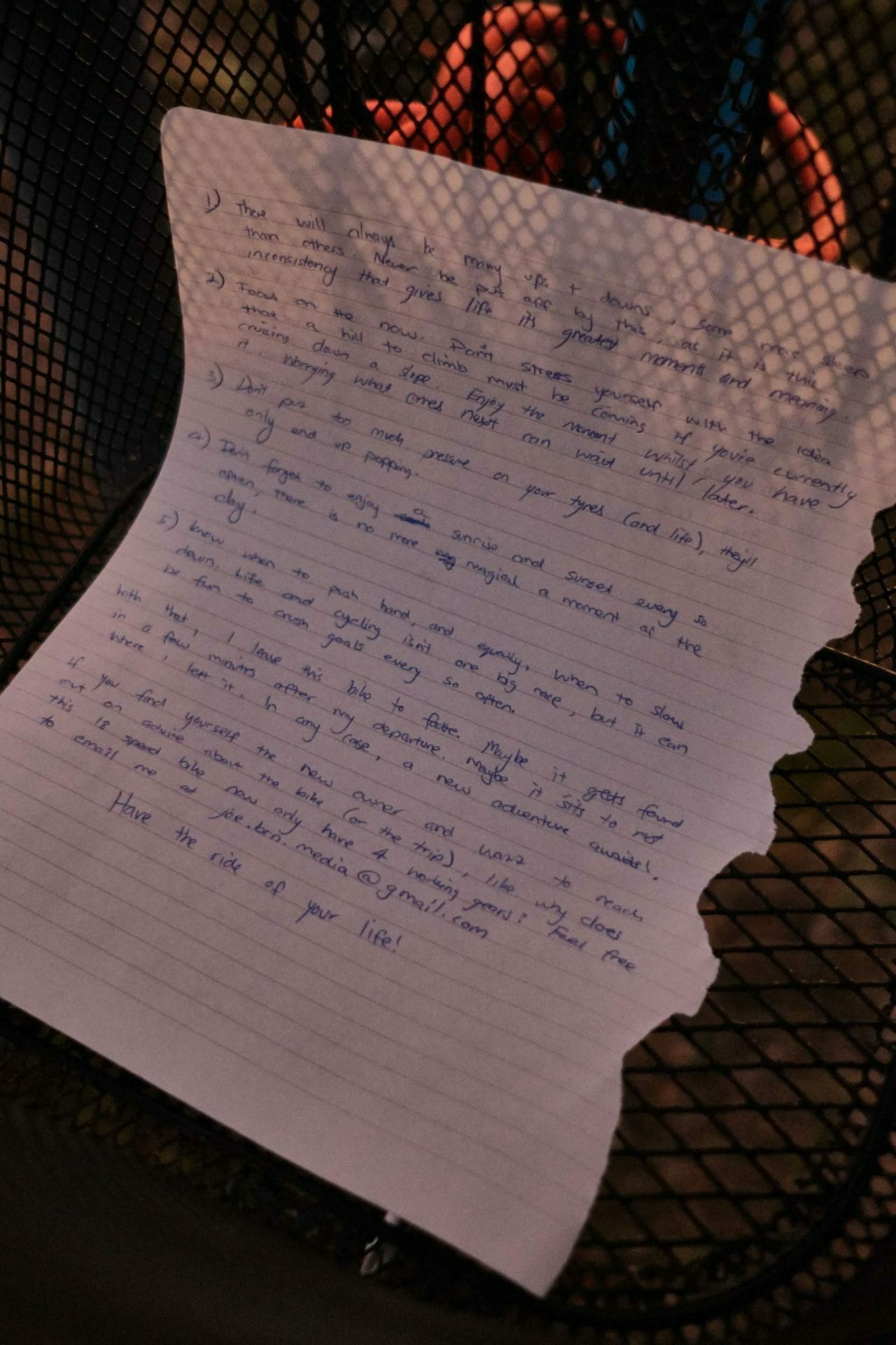 I was saddened to think that this was it, the perfectly unprepared duo was being separated once and for all. I didn’t think lugging the bike around with me was the best idea, so I wrote its story on a few loose pages, tucked them into the front basket, and left the bike unchained to whoever might find it useful. To start their own journey with it.