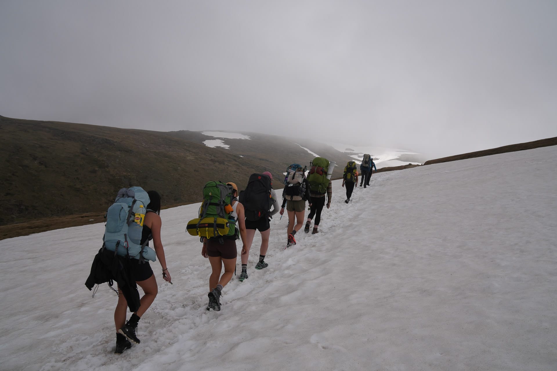 As we pushed on towards our camp for the night the weather shifted, fog reduced visibility to zero, and it got cold and windy. Voices got quieter and the group separated into smaller conversations. Arriving at Wilkinsons Creek, we set up our tents in a defensive wall against the wind, huddling in the middle to eat our dinner.