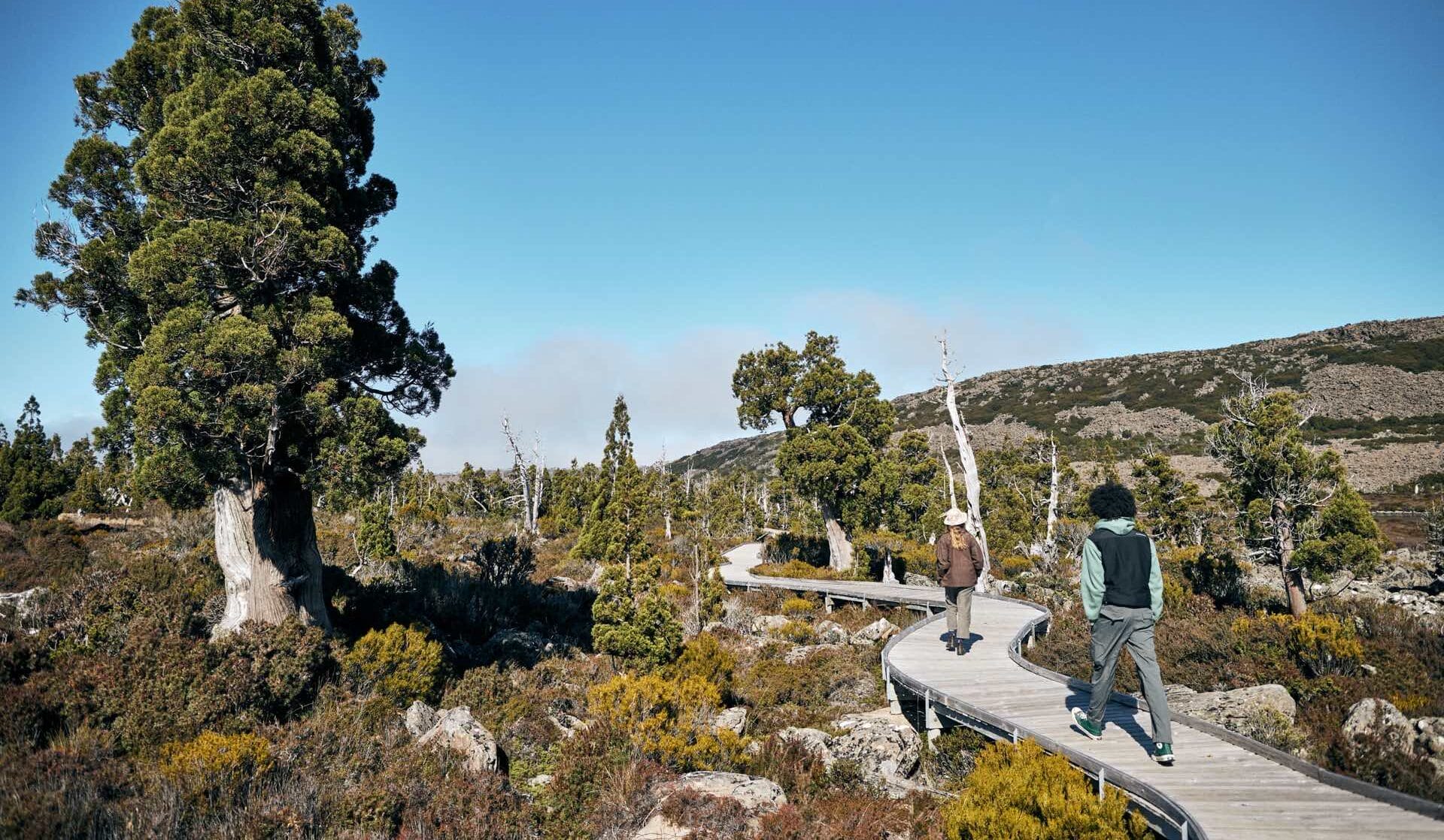 It’s easy to feel like you’ve spun back in time and might get chomped by a rogue dinosaur when you cruise this gentle path to Pine Lake, which is conveniently accessed from a car park just next to the road. The raised boardwalk takes you to a ridiculously clear lake fringed with one of the island state’s endemic and rarest trees: the ancient Pencil Pine, which evolved long before flowering plants.