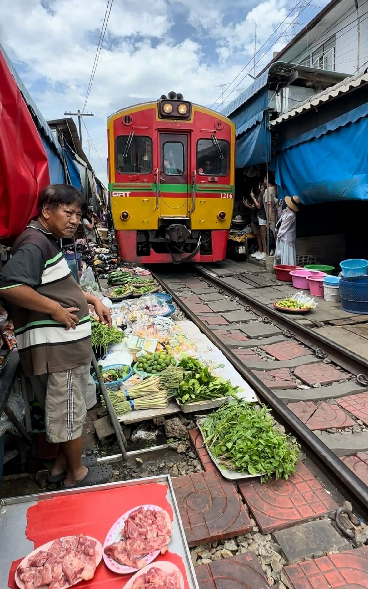The bustling bazaar existed for over a century before the railroad’s construction. So instead of moving elsewhere, sellers incorporated the slow-moving locomotive into their daily grind, quickly rearranging market stalls, taking down parasols, and moving neat mounds of produce off the railroad to make way for oncoming traffic. It’s an enthralling, chaotic watch that I can never pull my eyes away from.