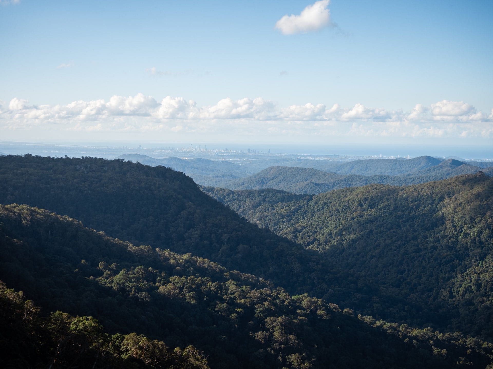 Just before reaching the car park, stop at the Canyon Lookout to take in the expansive views over the rainforest, Rainbow Falls tumbling over the escarpment in the distance, and towards the skyscrapers of the Gold Coast on the coast.