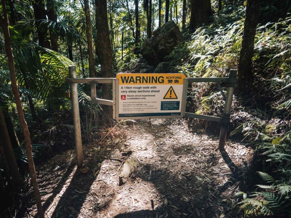 The Twin Falls Circuit turns left here to head to the base of Twin Falls (a worthy side trip to the first waterfall of this hike), while the Warrie Circuit continues to the right. There’s a fairly ominous warning sign here, ensuring that you’re prepared for the longer trail.