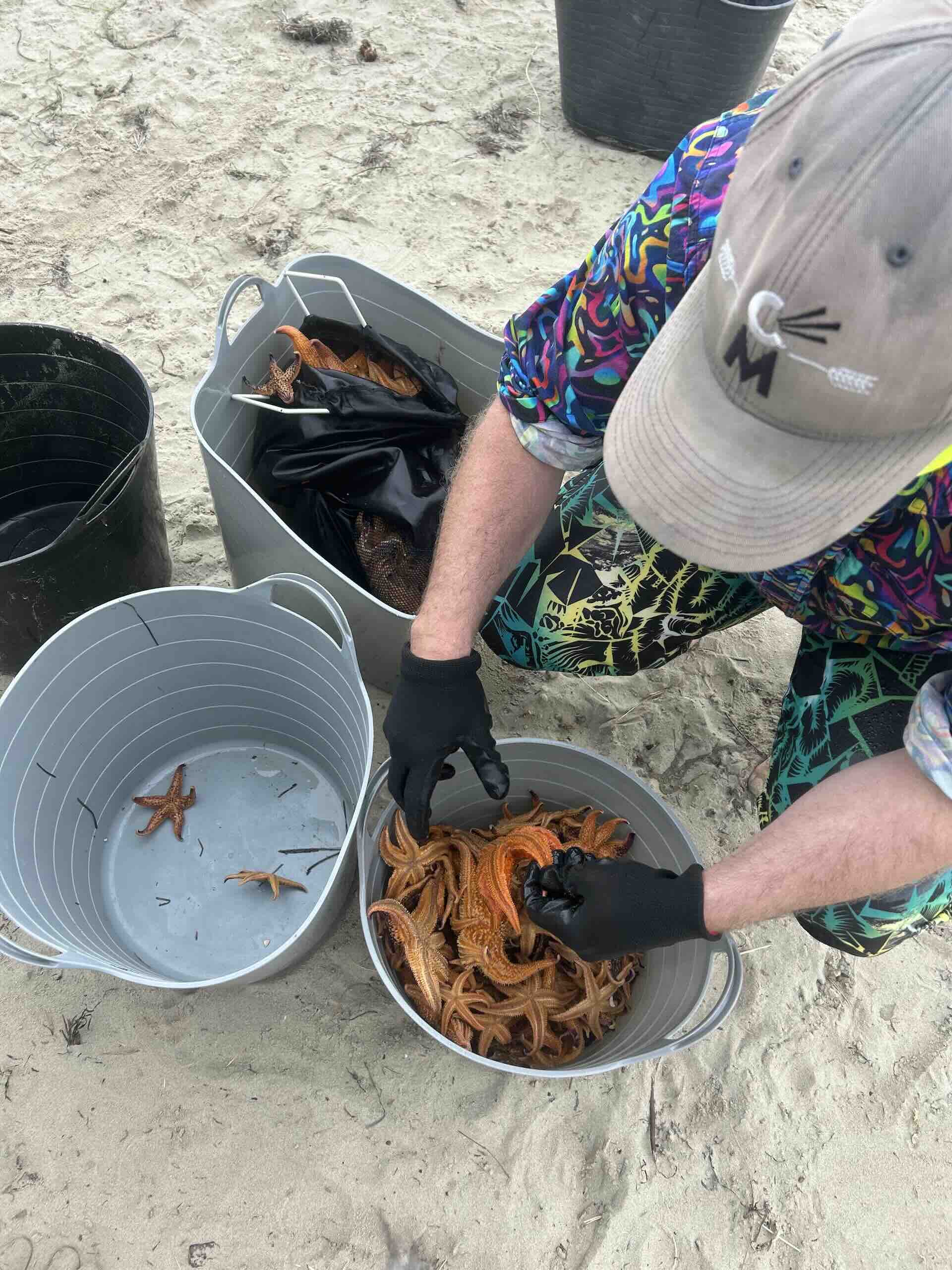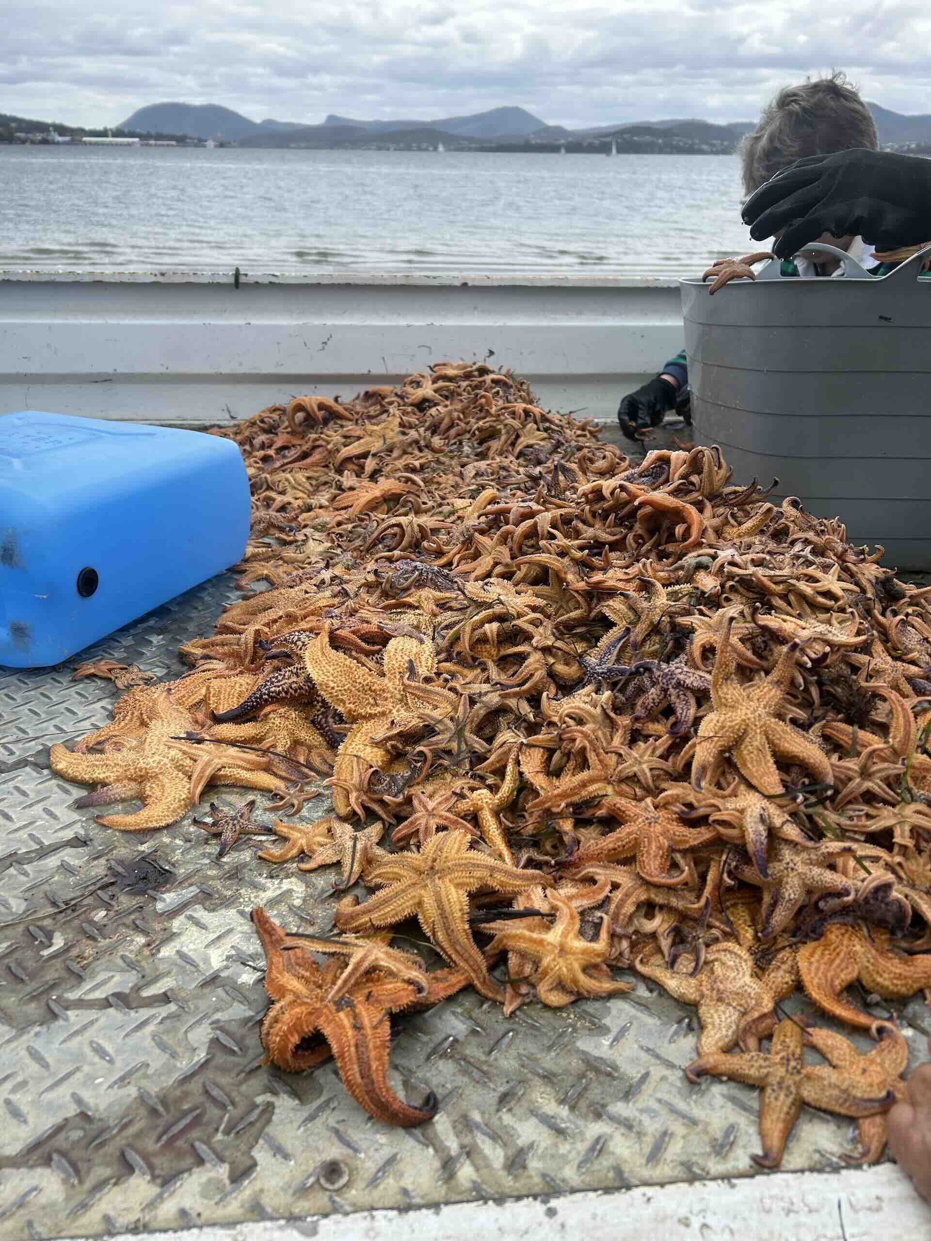 During James and Elysee’s time in Tas, they spoke to handfish experts Dr Tyson Bessell and Prof Neville Barrett, attended an invasive sea star clean up in Hobart, and met locals who have protested salmon farming, a major threat to the species.