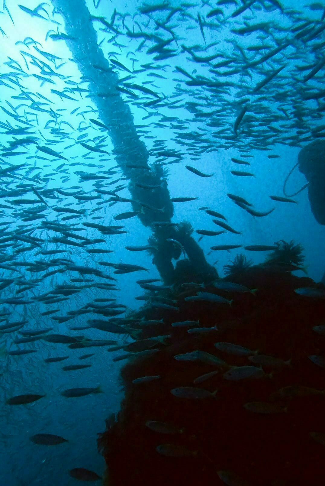 Once jumping off the boat you descend to the top of the structures which rests about eight metres underwater. Since I have my advanced diving licence, we went straight to the bottom to begin exploring the bases. These large triangular structures were incredible to see and we even swam through one of them.